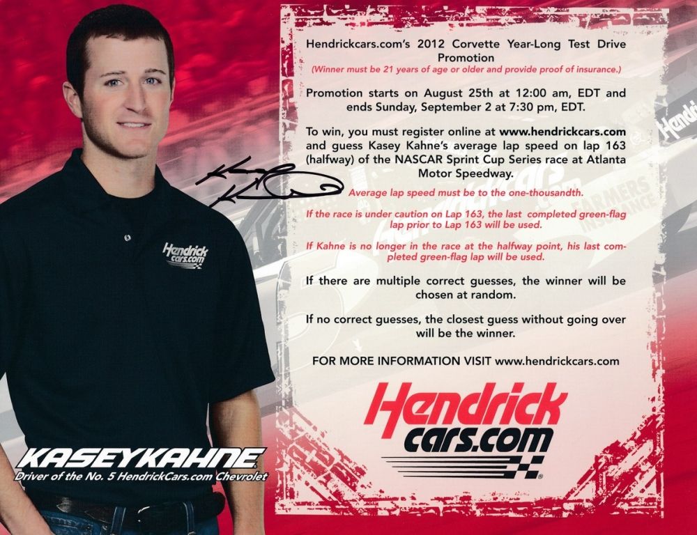 8" x 10" photo has been hand-signed in black felt-tip pen by Kasey Kahne. The autograph includes an LOA and lifetime authenticity guarantee from Pristine Auction.