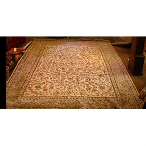 This is probably the best example of a Kashan Rug. This is a tightly woven, handmade carpet measuring 12'2" X 8'7 1/2". This rug has the traditional Kashan pattern with a single medallion in the center and Persian floral motifs, including arabesques and flower stems, palmettos, rosettes, blossoms and leaf motifs forming on of the densest patterns. The ivory is a predominate color in this rug but also has beautiful shades of gold, blue and pale green. This gorgeous rug is Circa 1950. Appraisal Price $11,900