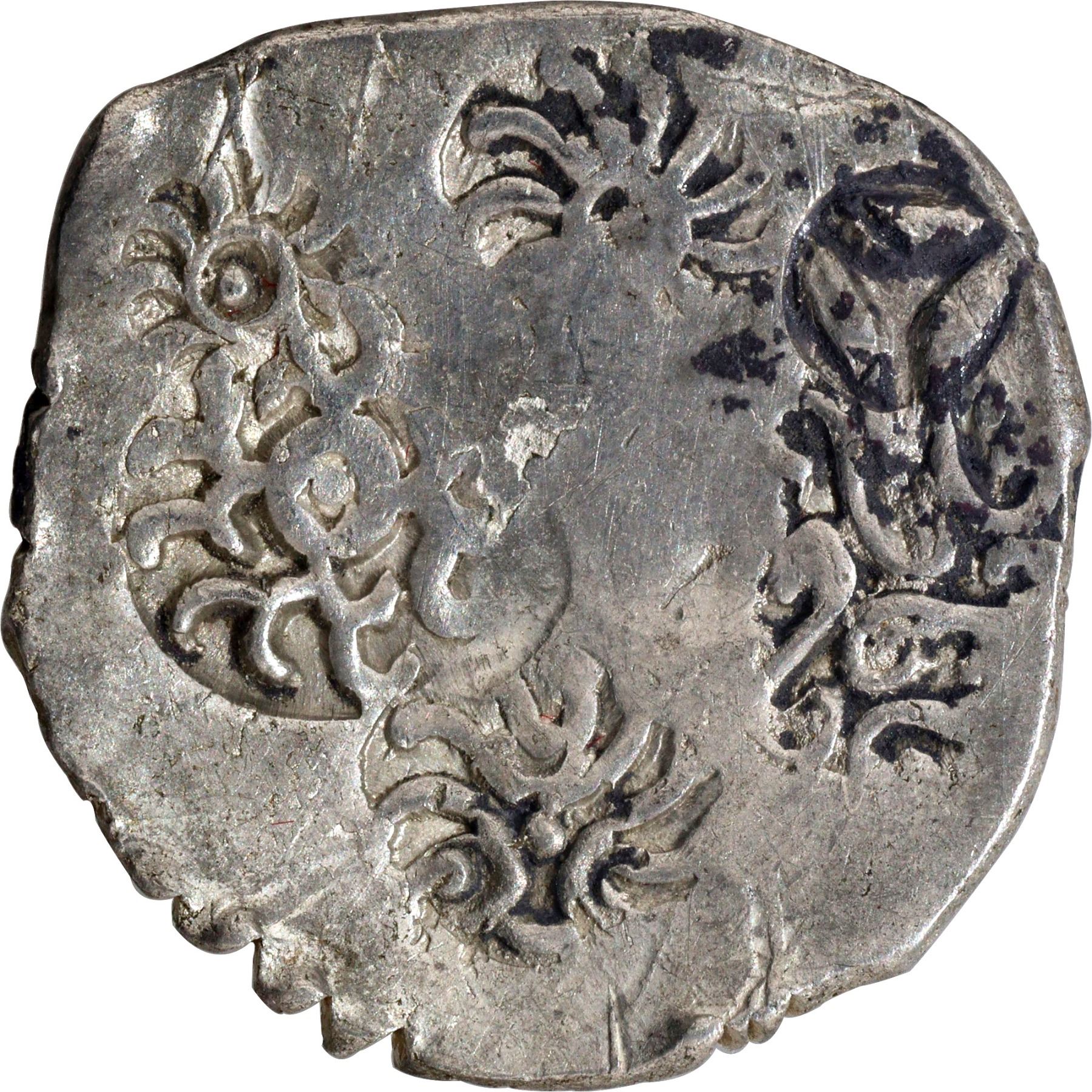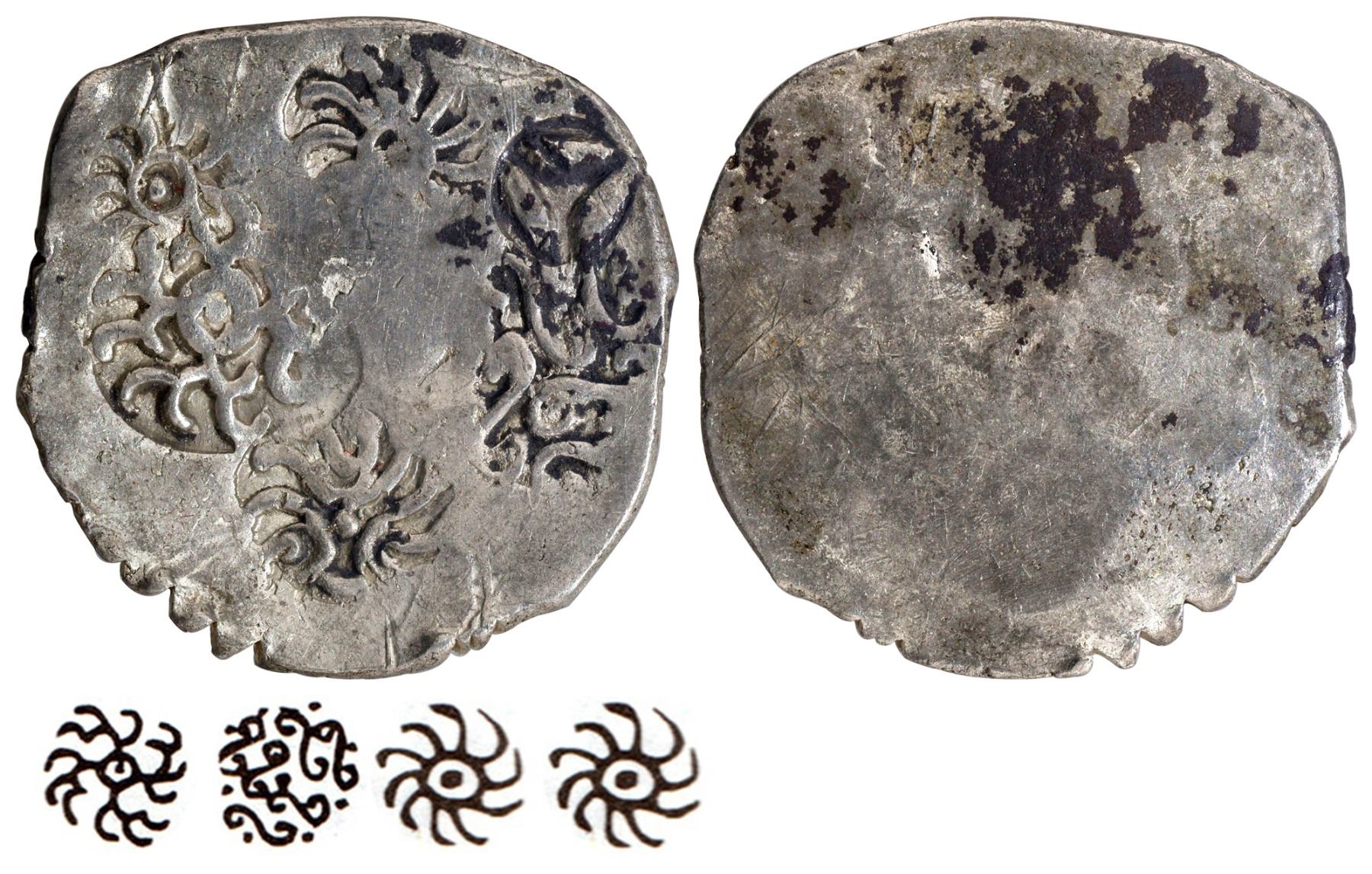 Punch Marked Coin, Kashi Janapada (600-465 BC), Silver Vimshatika, Archaic period, ABCC and Wheel type, Obv: four composite geometrical symbols, including a circle with a whorled design, a composite ‘S’ shapes geometrical design and a pair of wheels, other ancillary symbols, Rev: uniface, 5.0g, 25.8x24.9mm, (Unlisted type), about extremely fine, Very Rare.