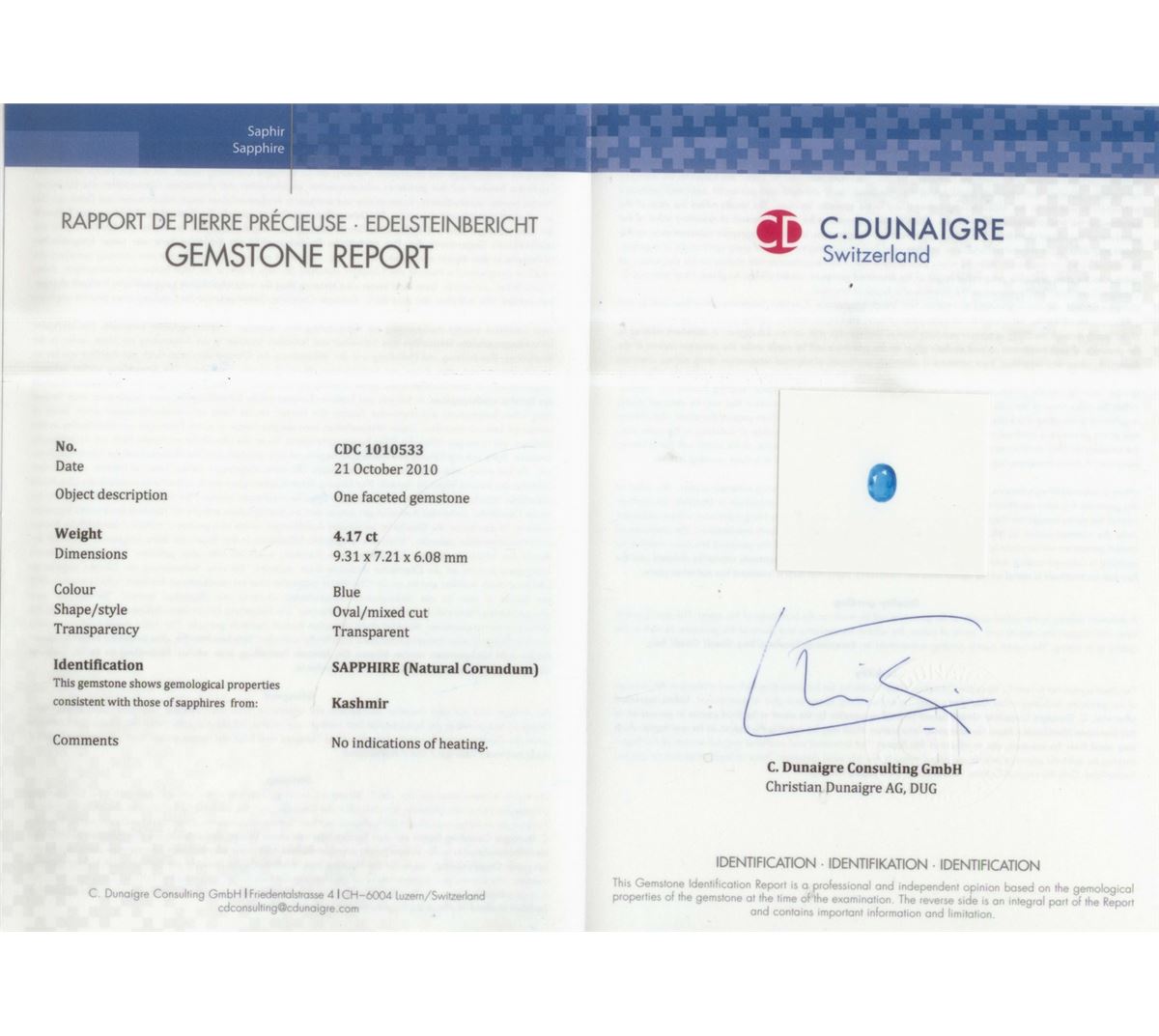 Kashmir Sapphire 4.17 ct ....certified by Swiss lab. Please contact us if you are looking for higher quality ...gem quality Kashmir sapphires. We have huge selection of Kashmir sapphires.