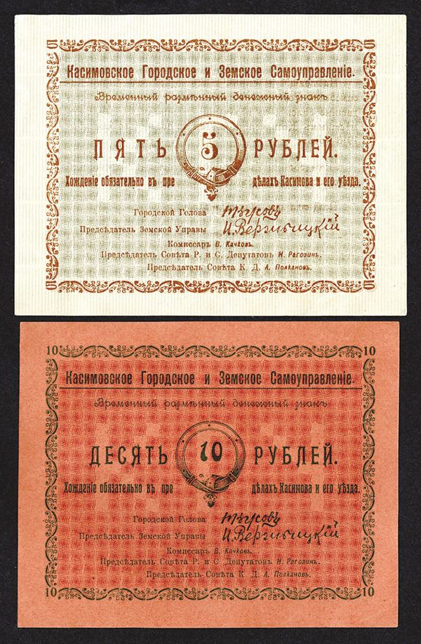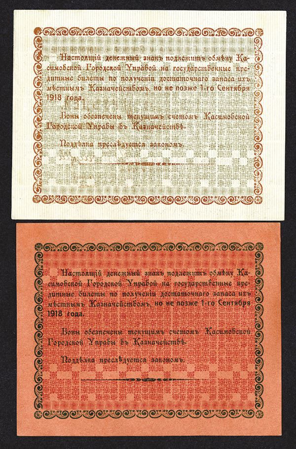 Russia, Lot of 2 notes, Includes 5 Rubles, R-2005, Brown on light blue undertint on white ribbed paper; 10 Rubles, R-2007, blue on red underprint on salmon colored paper, both AU to Uncirculated with the 5 Ruble with small edge faults on the right excess margin, attractive and rare local scrip notes.