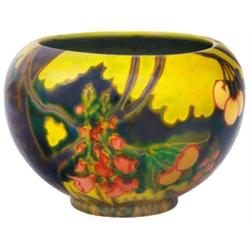 Kaspó, gyuszuvirágokkal és cseresznyefával, Zsolnay <p>Dekorterv: Nikelszky Géza, 1905 körül Porcelánfajansz, opak, fémszínu és transzparens eozinmázak, laposan kidomborodó, színes mázas dekor, mélyített, fényes kontúrozás, savmaratás Fazonszám: 644 Magasság: 10 cm, Szájátméro: 10 cm Jelzés: domború körpecsét