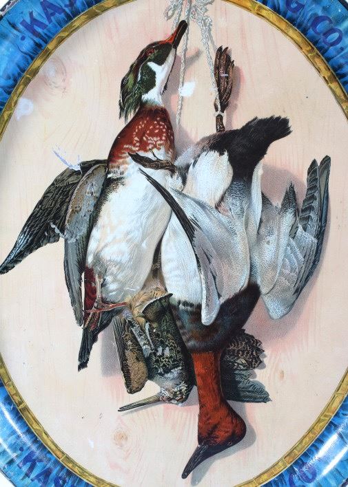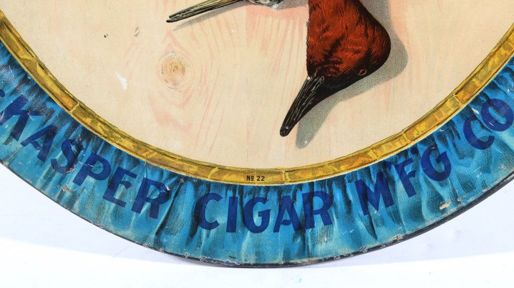 Featured in this lot we have a Kasper cigar MFG Co metal advertising tray. The tray shows the image of three hunted birds hanging from twine. The birds consists of two ducks and a sand piper. The border of the tray is marked "Kasper Cigar M'F'G Co. - Lord Coke" marked twice with "No 22" on the bottom. The tray shows a blue and yellow border. The piece is in good condition overall with some wear on the back and edges. The tray measures 16 1/2" long by 13 1/2" wide.