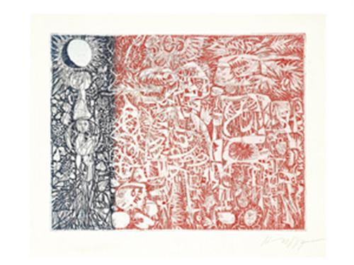 colour etching, paper. 43 x 50 cm. Signed lower right: Kass 77