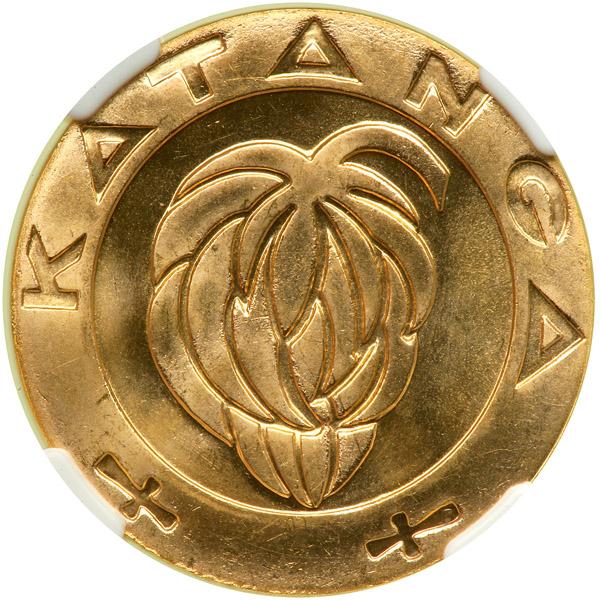 Katanga. 5 Francs, 1961. Fr-1; KM-2a. Weight 0.3857 ounce. Bananas. Reverse: Baluba cross. NGC graded MS-66.