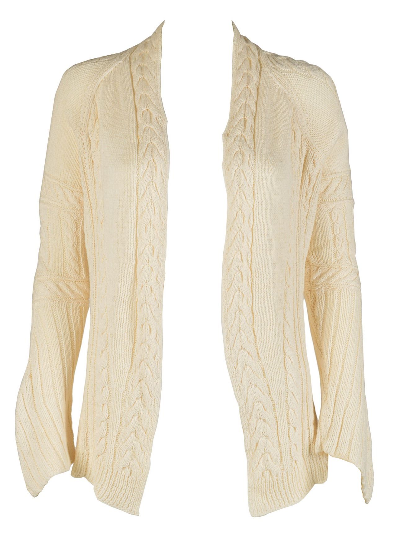 Attractive cable-knit cotton sweater with an open front, worn on screen by Kate Beckinsale in her role as Donna Newman in the 2006 comedy Click, seen during the therapy scene when her husband Michael (played by Adam Sandler) realizes another year has passed. The cream-colored sweater was made by Moth and is a size extra-small. In fine condition. Accompanied by a certificate of authenticity from Columbia Pictures.