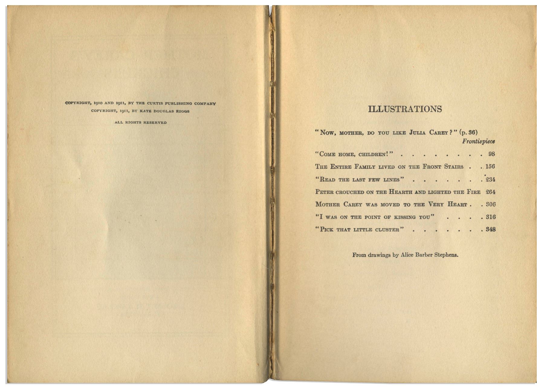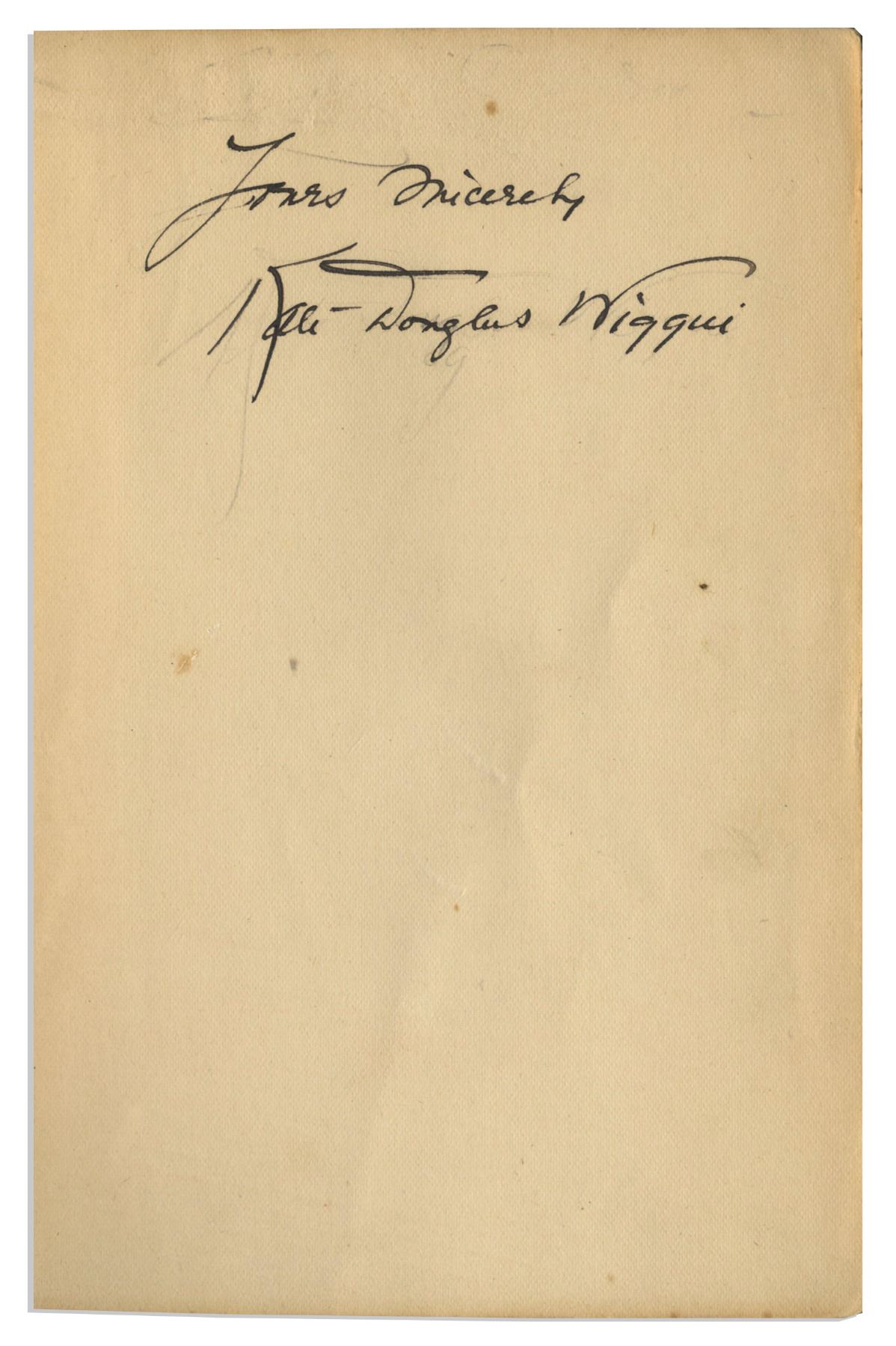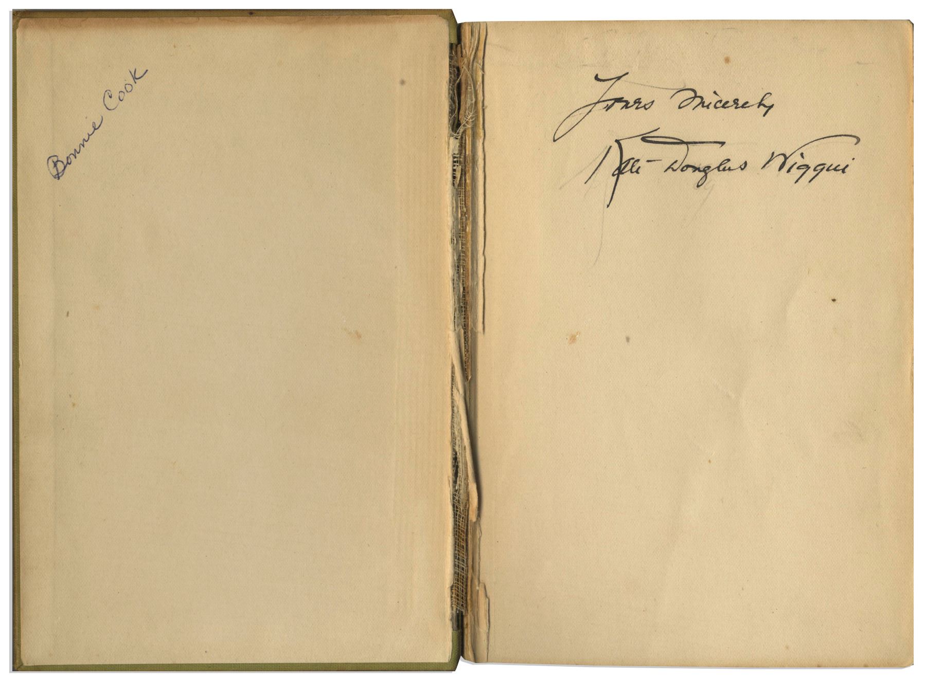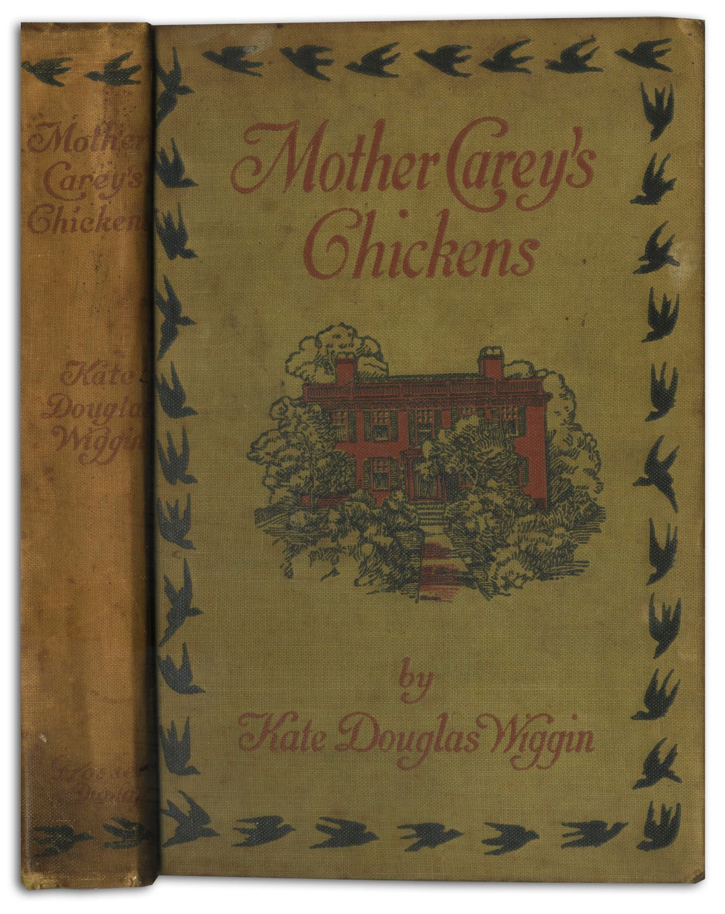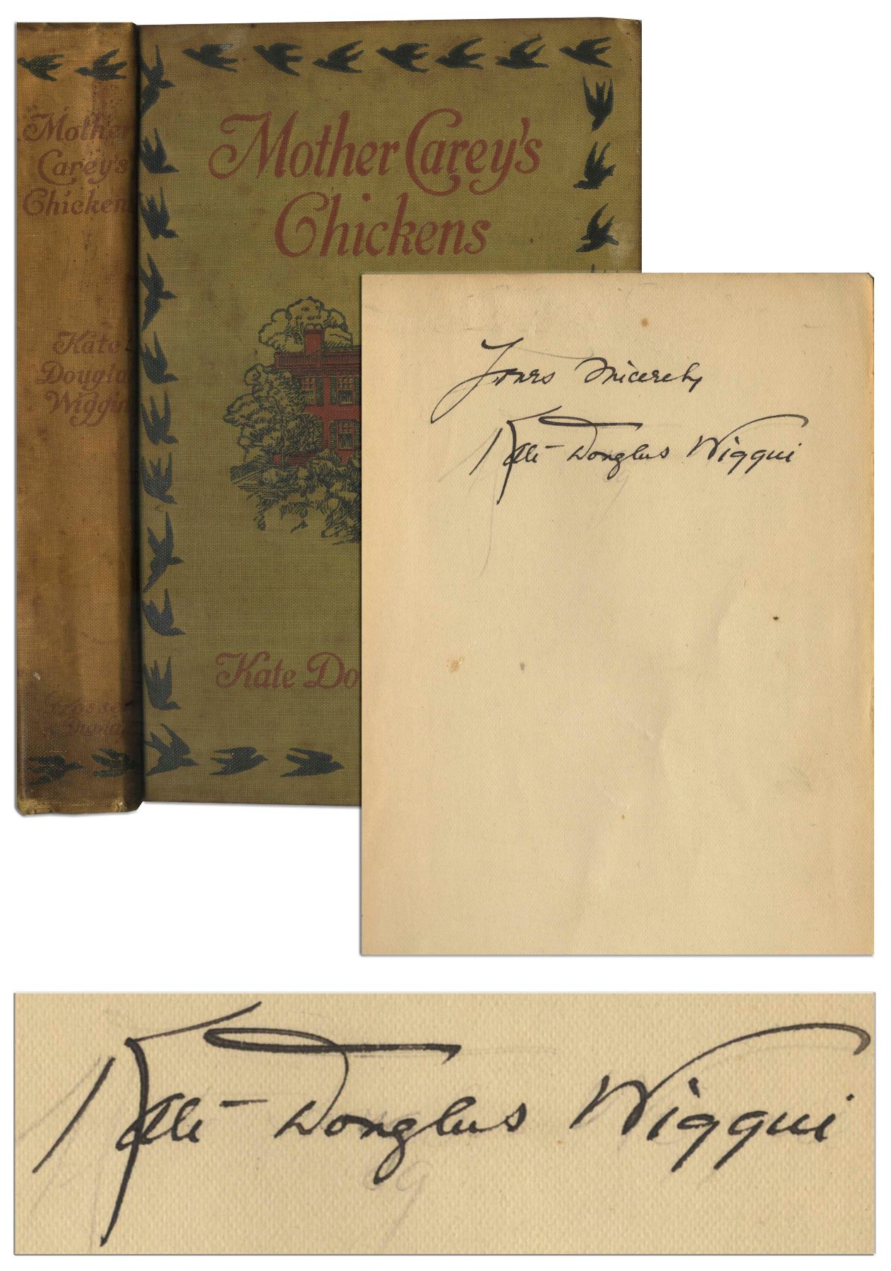 Kate Douglas Wiggin's signed copy of her novel ''Mother Carey's Chickens'', which was twice adapted into film in 1938 and 1963, the latter starring Hayley Mills. New York: Grosset & Dunlap, 1911. Wiggin signs the front free endpaper, ''Yours sincerely / Kate Douglas Wiggin''. Wiggin was an important reformer of children's education at the turn of the century, as the first person to found a free kindergarten school in San Francisco in 1878. Her passion for children's rights carried over to her successful career as an author of children's books. Illustrated book measures 5.25'' x 7.75''. Separation starting at joints and some soiling to boards. Previous owner's name on front pastedown. Overall in good condition.