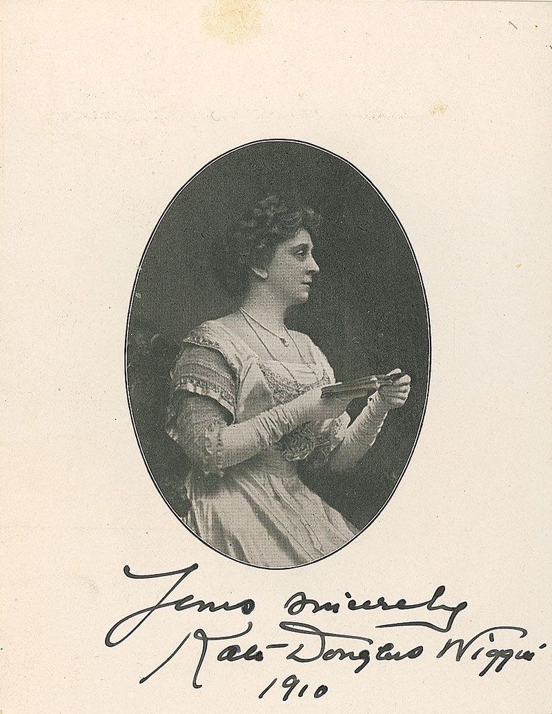 American author (1856–1923) best known for the juvenile classic Rebecca of Sunnybrook Farm. Vintage 4 x 5.25 photo, featuring an oval image of Wiggin, signed in the lower border in black ink, “Yours sincerely, Kate Douglas Wiggin.” In fine condition, with a bit of scattered light toning to borders.