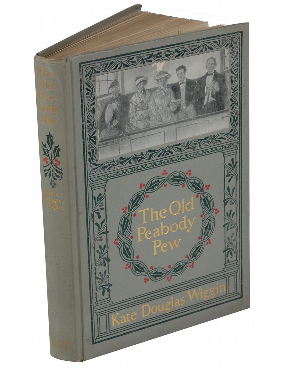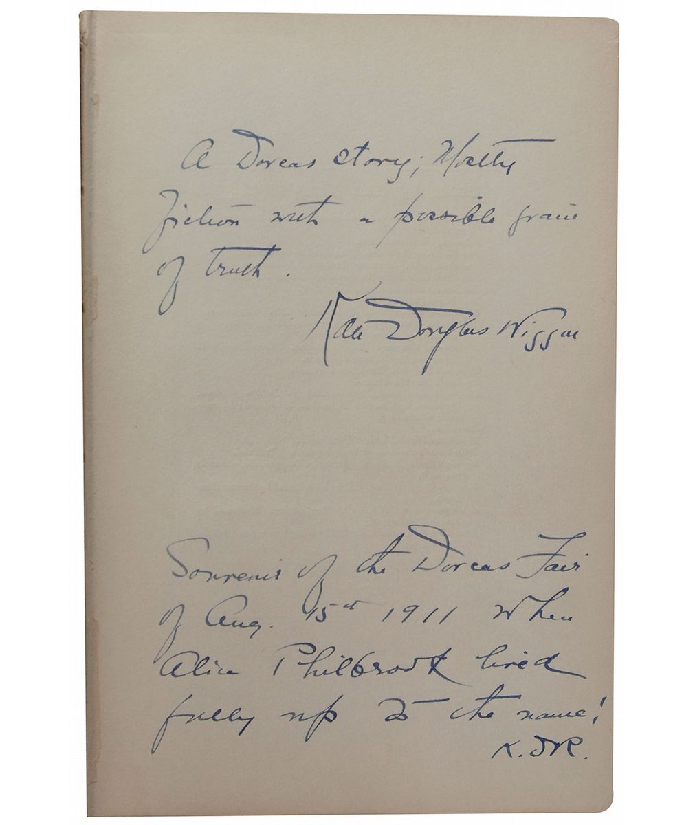 Signed book: The Old Peabody Pew. Later printing. Boston and New York: Houghton Mifflin, 1907. Hardcover, 6 x 8.75, 143 pages. Signed on the first free end page, “A Dorcas story; Mostly fiction with a possible grain of truth, Kate Douglas Wiggin. Souvenir of the Dorcas Fair of Aug. 15th 1911, where Alice Philbrook lived fully up to the name! K. D. R.” Page opposite the first free end page also bears Wiggin’s affixed bookplate. In fine condition, with a cracked front hinge.