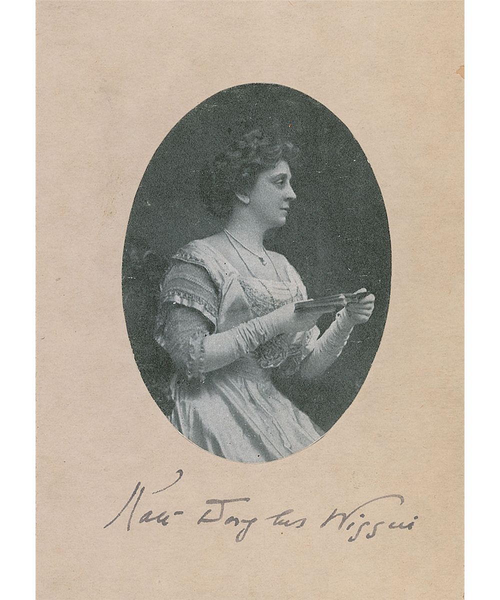 American author (1856–1923) best known for the juvenile classic Rebecca of Sunnybrook Farm. Vintage ink signature, “Kate Douglas Wiggin,” on an off-white 2.25 x 3 card bearing an affixed image of the author. In fine condition.