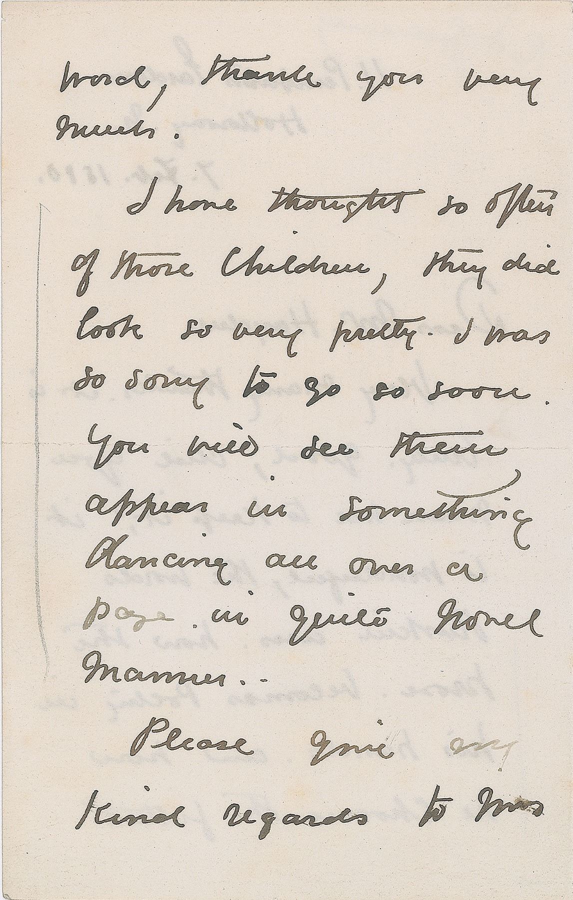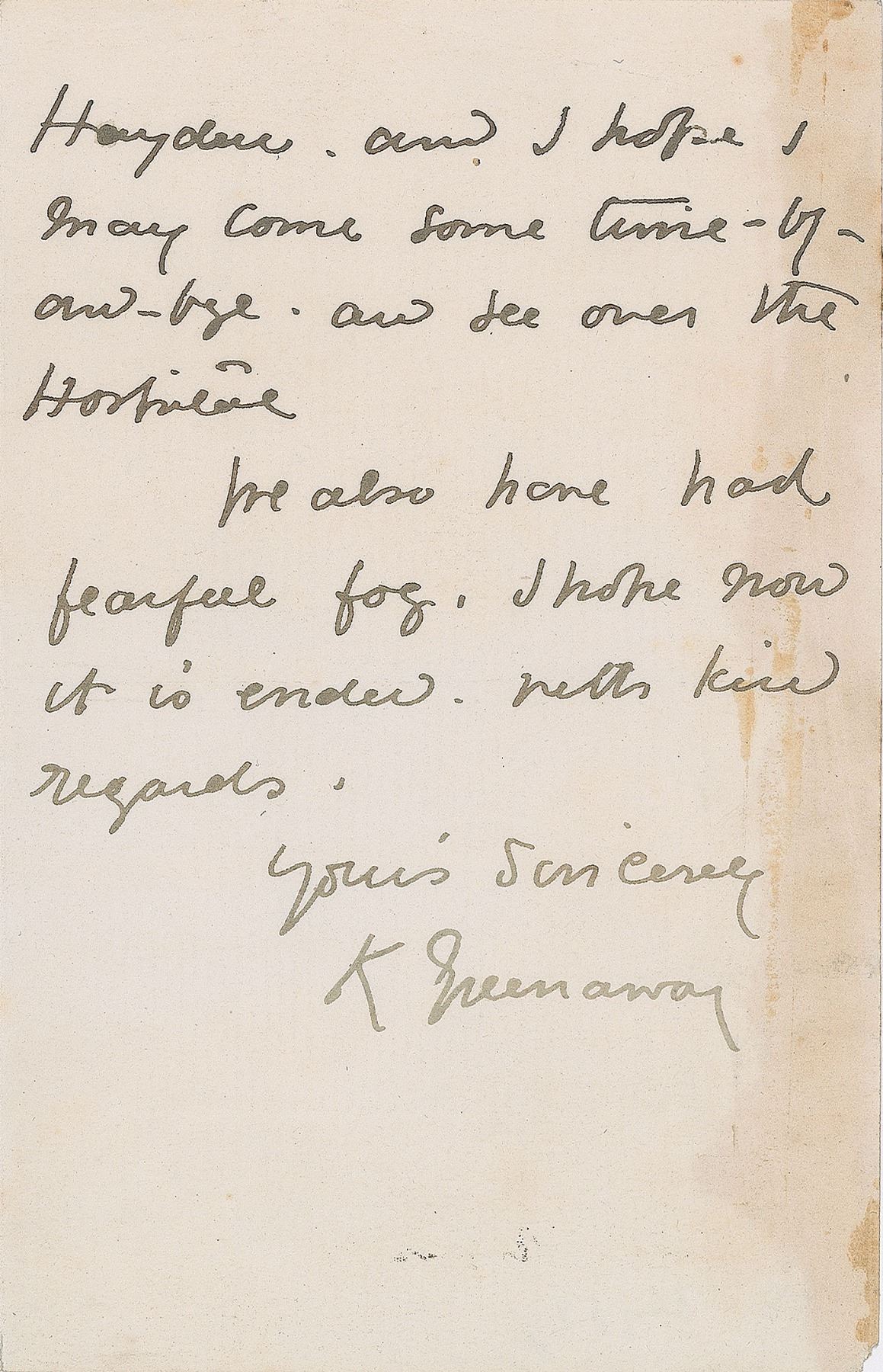 British children's author and illustrator (1846-1901) whose distinctively illustrated books were among the most popular 'juvenile' works of the Victorian age. ALS signed “K. Greenaway,” three pages on two adjoining sheets, 3.5 x 5.5, February 7, 1880. Written from Pemberton Gardens, a letter to G. H. Hayden, in full: "Very many thanks, it is truly good, did you mean me to keep it? it is wonderful, the words Ruskin uses, how the prose becomes poetry in his hands how he chooses the fittest word, thank you very much. I have thought so often of those children, they did look so very pretty. I was so sorry to go so soon. You will see them appear in something dancing all over a page in quite novel manner. Please give my kind regards to Mrs. Hayden, and I hope I may come some time–by–and-bye and see over the hospital. We also have had fearful. I hope now it is ended. With kind regards." In very good to fine condition, with show-through along the right side of the final page from old adhesive residue on the reverse. John Ruskin was an English critic and author who featured illustrations by Greenaway in his books For Clavigera (1883) and Dame Wiggins of Lee and Her Seven Wonderful Cats (1885).