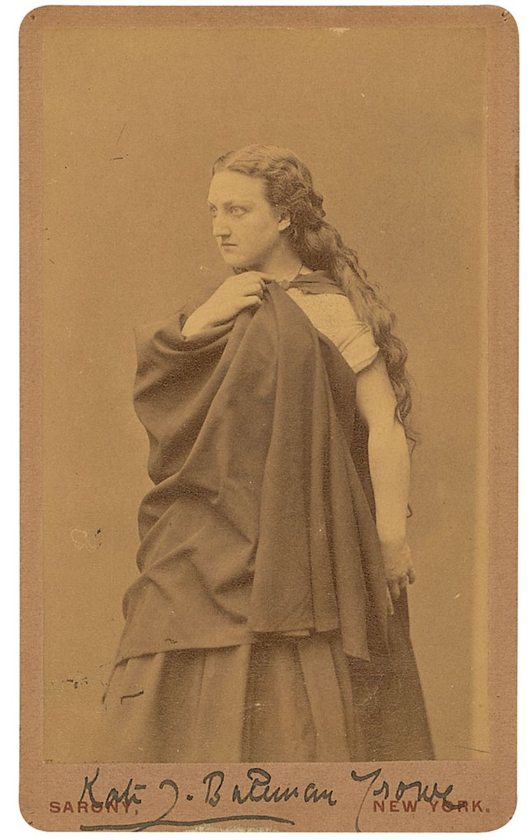American actress (1842–1917) who appeared as Lady Macbeth opposite Henry Irving in 1875. Original 2.5 x 4 carte-de-visite portrait of Bateman in costume as Leah by Sarony of New York, signed in the lower border in black ink, “Kate J. Bateman Crowe.” Moderate overall toning, and ink notations and light mounting remnants to reverse, otherwise fine condition.