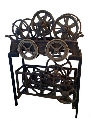 The film Kate and Leopold opens with a fly through the interior of a fanciful Big Ben style clock tower. This miniature clock mechanism was designed by New Deal Studios Cofounder Ian Hunter and featured on- screen during the opening title sequence. The miniature was shot with a snorkel lens and the gears were motorized to sync their movement with the camera. Fabricated from steel, MDF, urethane, and laser cut gears, the side of the miniature features a rapid prototyped, "grown" man-in-gear logo matching the logo of Hunter Gratzner Industries, the predecessor to New Deal Studios. Includes steel display stand. 41" wide x 57" tall. 1:4 scale. Also includes Original pencil sketch by New Deal Studios Co-Founder Ian Hunter of his design of the clock interior for the opening credit sequence. Original pencil sketch by New Deal Studios Co-Founder Ian Hunter of his design of the clock tower exterior for the opening credit sequence. Original storyboards in pencil of the opening credit sequence fly through of the interior clock tower. Drawn by New Deal Studios Co-Founder Ian Hunter.