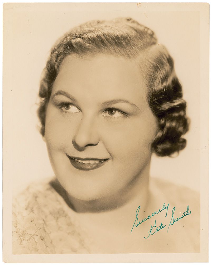 Vintage pearl-finish 8 x 10 head-and-shoulders photo, signed in green fountain pen, “Sincerely, Kate Smith.” Rippling along left edge and some other scattered light bends, rubs, and creases, otherwise fine condition.