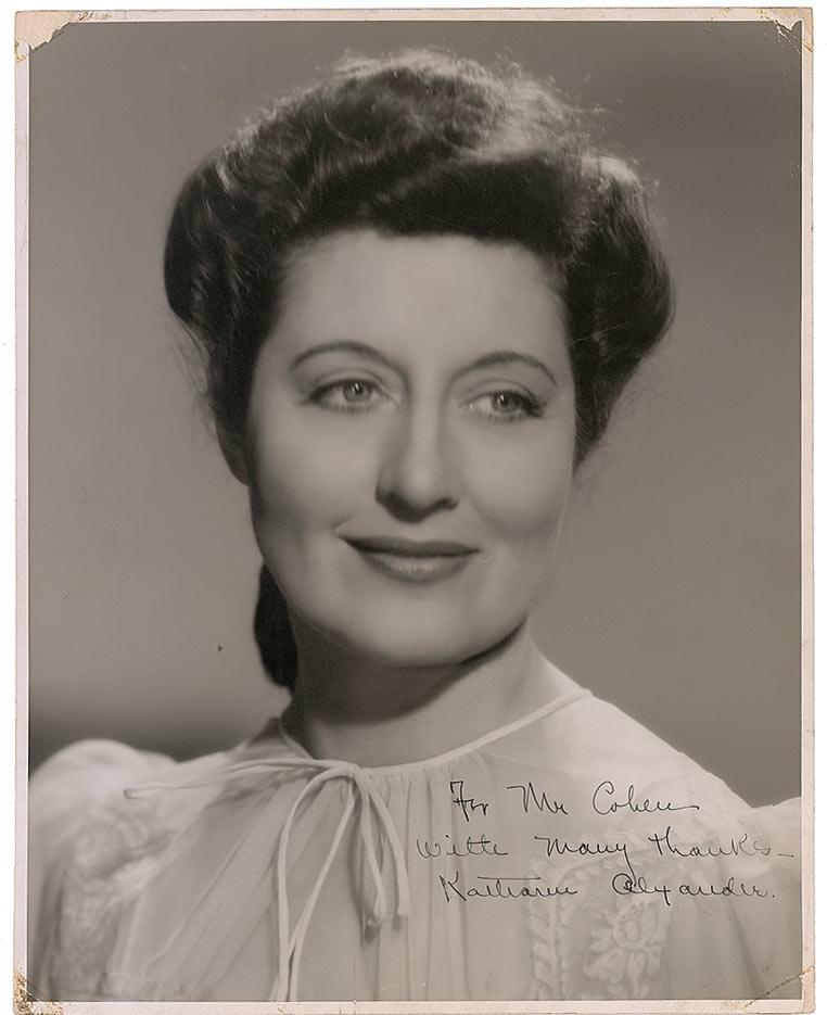 Vintage matte-finish 11 x 13.75 close-up photo, signed and inscribed in fountain pen, “For Mr. Cohen, with many thanks–Katharine Alexander.” In very good condition, with scattered surface creasing, adhesive remnants to the corners as well as paper loss to the upper corners.