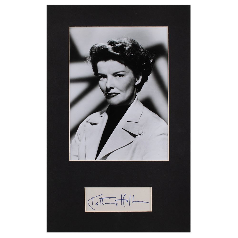 Two items: a felt tip signature, "Katharine Hepburn," on a white 4.25 x 1.5 card, matted with a portrait to an overall size of 9.5 x 15; and a TLS signed "K. Hepburn," one page, personal letterhead, May 6, 1993, in full: "Thank you very much for your enthusiasm." In fine condition. Accompanied by the original mailing envelope for the letter.