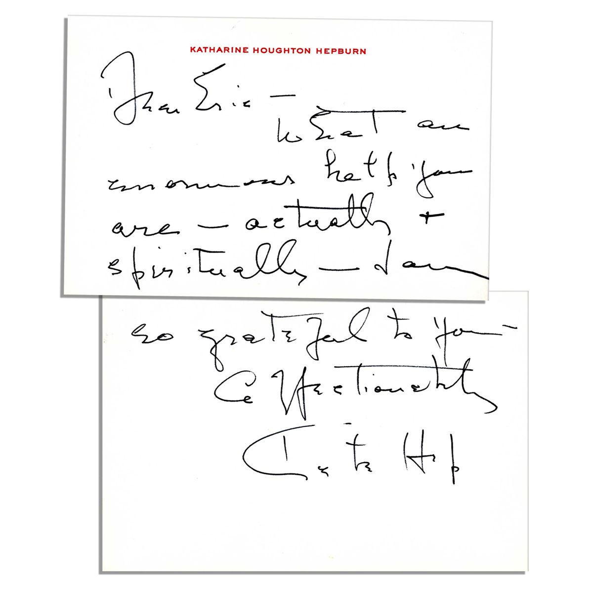 Legendary actress Katharine Hepburn autograph note signed on her personal stationery. Letter reads in full: ''Dear Eric - What an enormous help you are - actually + spiritually - I am so grateful to you - Affectionately, Kath Hep''. With her name ''Katharine Houghton Hepburn'' printed in red at top. 2pp. letter on a single card measures 4'' x 6'' and is near fine. Includes original envelope addressed in Hepburn's hand to Eric Harrison.
