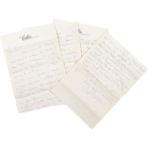 <B>Katharine Hepburn Eight-Page Handwritten Letter.</B></I> As signed material by Katharine Hepburn is rare -- she was not kindly disposed to autograph seekers, in person or by mail -- this eight-page letter is an embarrassment of riches. It is undated, handwritten in blue ink on four sheets of hotel stationery (front and back) and mailed by the legendary actress to her friend, make-up artist Emile LaVigne. In it she discusses friends and family, life in New England, and even drops a line or two about Spencer Tracy. The letter is in Excellent condition, with some fold creases and mild tanning, and is accompanied by the original mailing envelope, postmarked October 11, 1945.<I>From the estate of Emile LaVigne.</B></I><BR><BR><b>Shipping:</b> Small Flat (<a target="_blank" href="http://www.heritageauctions.com/common/shipping.php">view shipping information</a>)