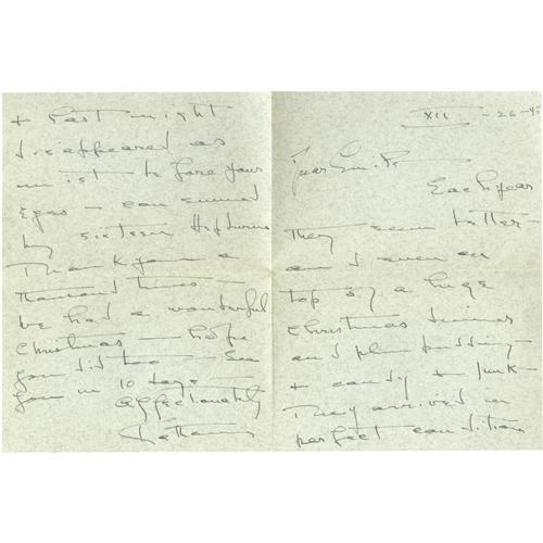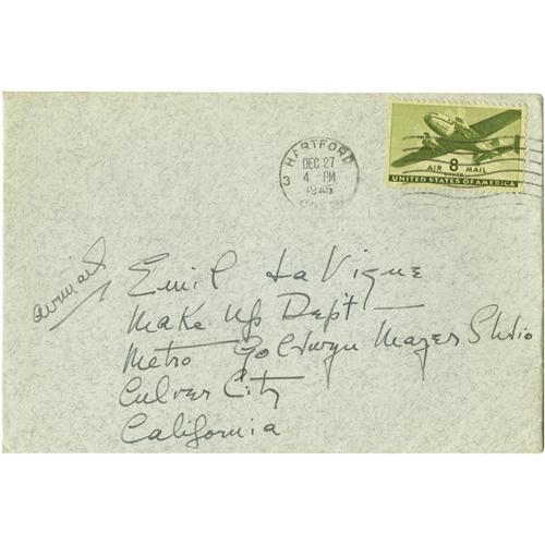 <B>Katharine Hepburn Handwritten Letter.</B></I> A single-page, double-sided handwritten letter to Emile LaVigne dated December 26, 1945, and signed by Katharine Hepburn in black ink. In Very Fine to Excellent condition with mild wear and a mailing crease, accompanied by the original envelope.<I>From the estate of Emile LaVigne.</B></I><BR><BR><b>Shipping:</b> Flat Material, Small (<a target="_blank" href="http://www.heritageauctions.com/common/shipping.php">view shipping information</a>)