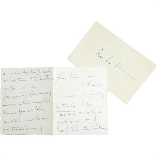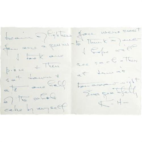 <B>Katharine Hepburn Handwritten Letter to Emile LaVigne's Wife.</B></I> A single-page, double-sided letter from Katharine Hepburn to the wife of Emile LaVigne, thanking her for a cake, handwritten and signed by Hepburn in blue ink. In Excellent condition with mailing creases. <I> From the Estate of Emile LaVigne.</B></I><BR><BR><b>Shipping:</b> Flat Material, Small (<a target="_blank" href="http://www.heritageauctions.com/common/shipping.php">view shipping information</a>)