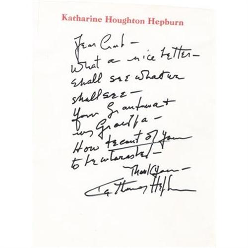 <B>Katharine Hepburn Handwritten Note.</B></I> A single-page handwritten note in black ink on personal stationery, undated, written and signed by Hepburn. In Excellent condition. <I>Accompanied by LOA from PSA/DNA.</B></I><BR><BR><b>Shipping:</b> Flat Material, Small (<a target="_blank" href="http://www.heritageauctions.com/common/shipping.php">view shipping information</a>)