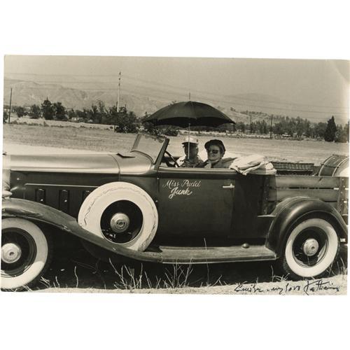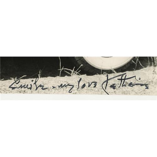 <B>Katharine Hepburn Signed Photo.</B></I> A b&w 14" x 11" photo of Hepburn and lifelong friend Emile LaVigne in an antique car, inscribed "Emile, My love" and signed by her in black ink. Ms. Hepburn was famous for being a non-signer of autographs and refused countless requests -- here's her inscription and signature in most desirable form! In Excellent condition.<I>From the estate of Emile LaVigne.</B></I><BR><BR><b>Shipping:</b> Small Flat (<a target="_blank" href="http://www.heritageauctions.com/common/shipping.php">view shipping information</a>) <BR><BR><B>Important notice:</