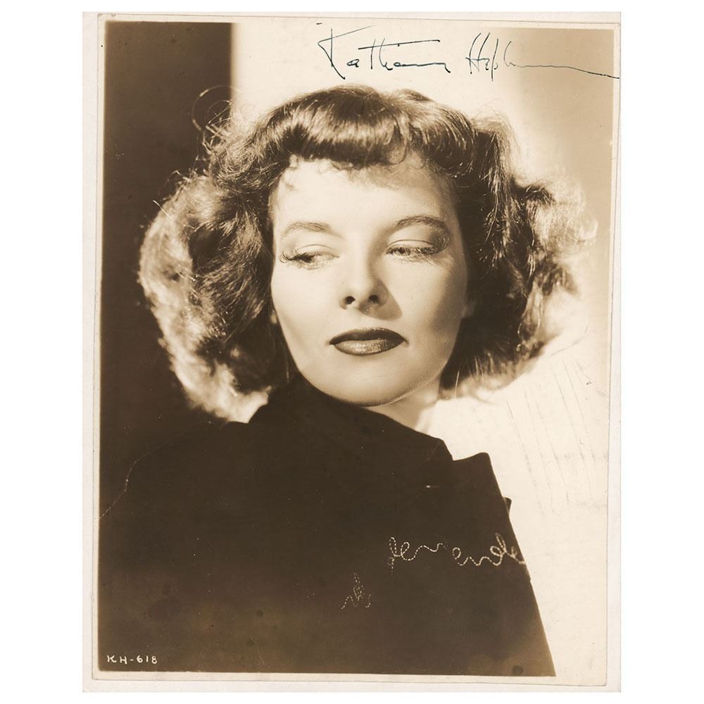 Vintage glossy 7.25 x 9.5 photo of Hepburn gracefully glancing over her shoulder, nicely signed across the top in fountain pen. Affixed to a slightly larger mount and in very good to fine condition, with a light scratch passing across her chin, and some creasing to the lower right background area.