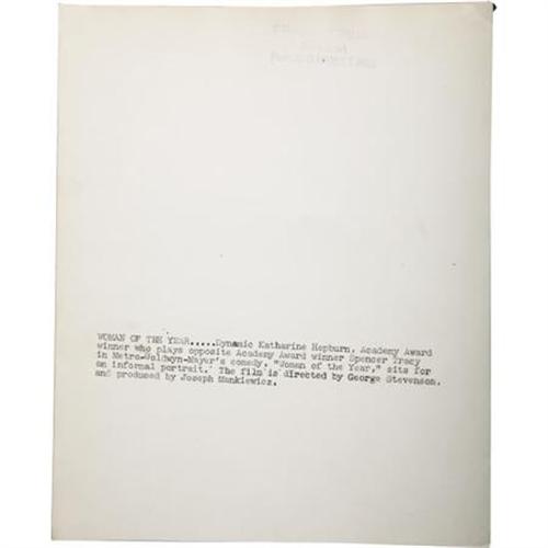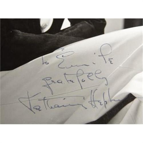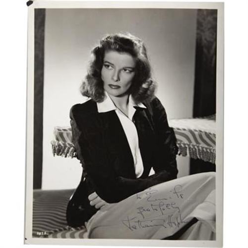 <B>Katharine Hepburn Signed Promo Photo.</B></I> A vintage promo b&w 8" x 10" portrait of Katharine Hepburn issued to promote the 1942 romantic comedy <I>Woman of the Year</B></I> (her first with Spencer Tracy), inscribed to friend and make-up artist Emile LaVigne and Signed by her in black ink. In Very Fine to Excellent condition with very mild wear and a studio caption printed on the back. <I> From the Estate of Emile LaVigne.</B></I> <I>Accompanied by LOA from PSA/DNA.</B></I><BR><BR><b>Shipping:</b> Flat Material, Small (<a target="_blank" href="http://www.heritageauctions.com/common/shipping.php">view shipping information</a>)