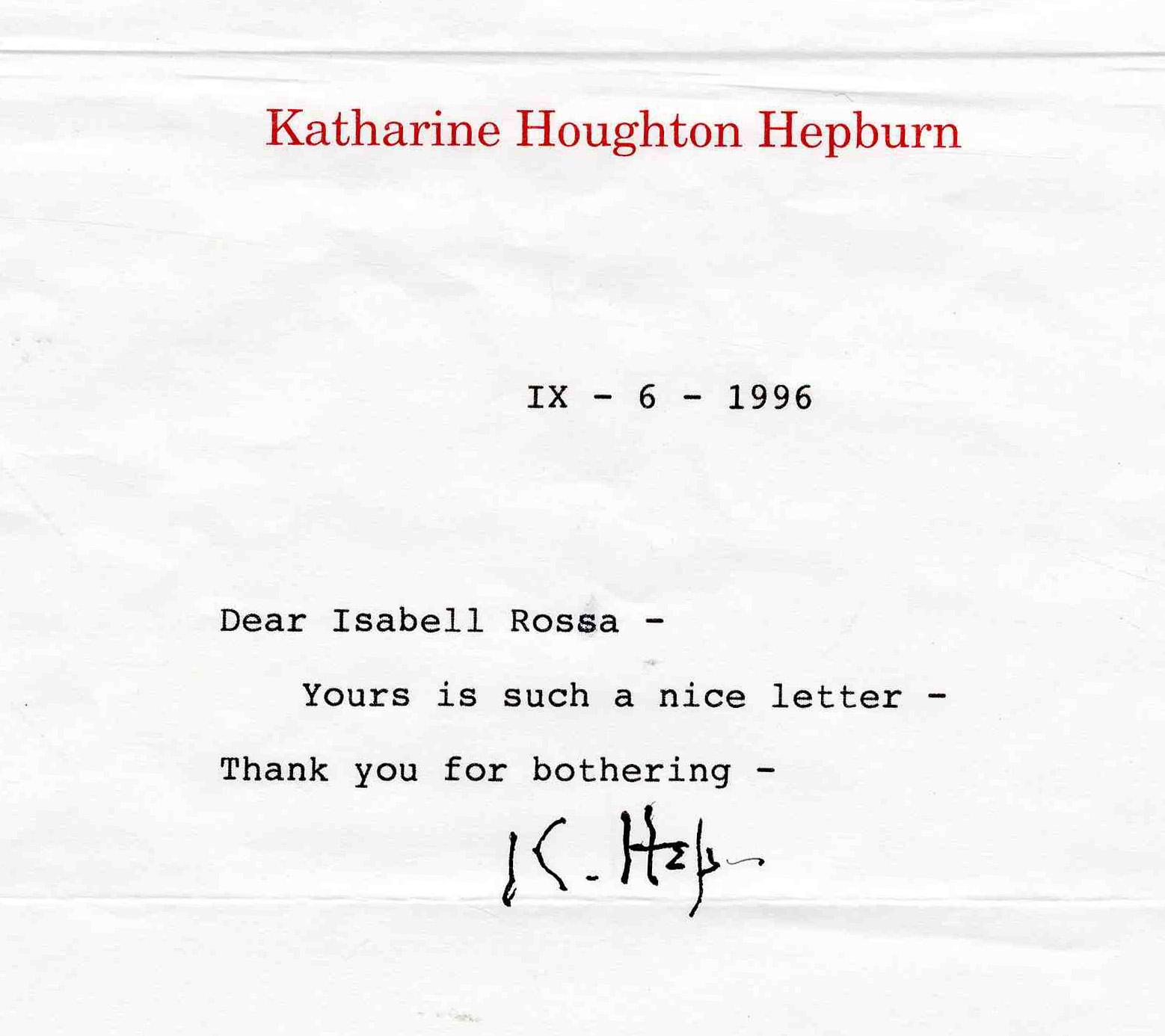 Katharine Hepburn TLS -- ''IX - 6 - 1996…such a nice letter…Thank you for bothering…'' -- Signed in Ink ''K. Hep-'' -- With Cover -- Excellent