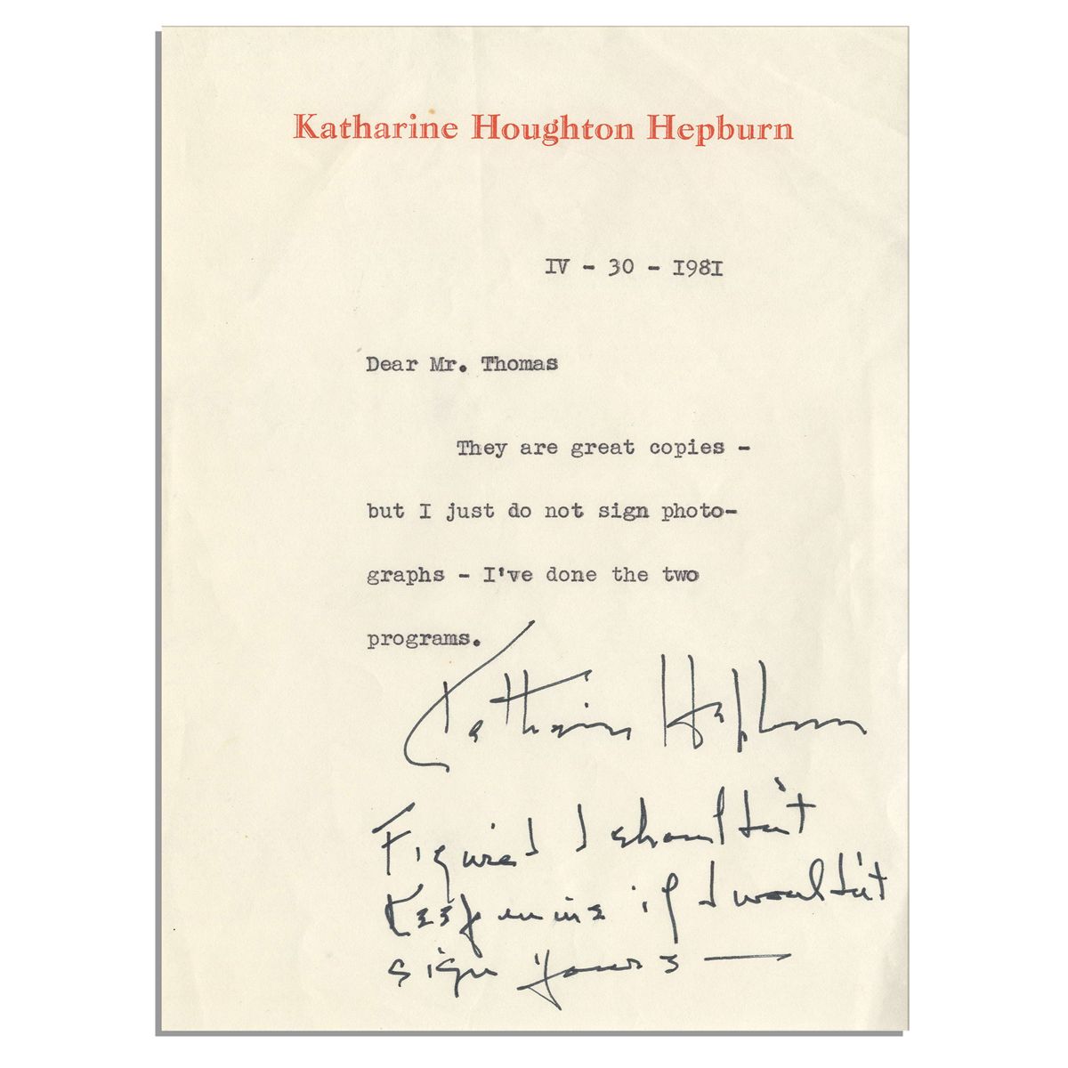 Katharine Hepburn typed letter signed with autograph postscript. Upon her personal stationery, the great movie actress writes, ''Dear Mr. Thomas, They are great copies - but I just do not sign photographs - I've done the two programs. [signed] Katharine Hepburn [autograph postscript] Figured I shouldn't keep [illegible] if I wouldn't sign yours''. Single-page letter measures 6'' x 8''. Near fine.