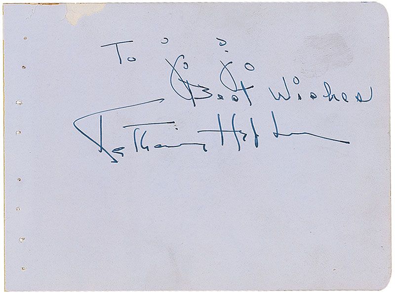 Scarce pairing of vintage circa 1941 fountain pen signatures and inscriptions, “To Jo Jo, Best Wishes, Katharine Hepburn” and “To Jo-Jo—with my best wishes—Sincerely, Spencer Tracy,” on opposing sides of a single light blue 6 x 4.5 album page. In fine condition, with a fingerprint above Hepburn’s inscription and a trivial bit of surface loss to the top edge. Accompanied by a photocopied provenance statement from the original recipient, explaining that his grandfather landed a job as a gatekeeper at MGM via family recommendation—he was the uncle of Margaret Shenberg, the wife of studio head Louis B. Mayer. He acquired these autographs for his grandson, ‘Jo Jo,’ in anticipation of his Bar Mitzvah, and presented him with an album of stars’ autographs as a gift on the occasion. While it is unusual to find these signatures on a single item, what is most remarkable about is that they must date to the very beginning of the romance between Hepburn and Tracy. They did not meet until being cast as co-stars for Woman of the Year, and their enduring relationship began during filming, which lasted from August 1941 through the end of the year—the same period in which these signatures were obtained.
