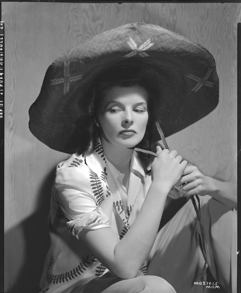 (M-G-M, 1941) Black-and-white 8 x 10 in. camera negative on safety film of Katharine Hepburn from Woman of the Year by Clarence Sinclair Bull; with SEP 2 41 PUB 1209 BULL 64 stamped on the border, MG87015 MGM in India ink and extensive retouching. Very fine.