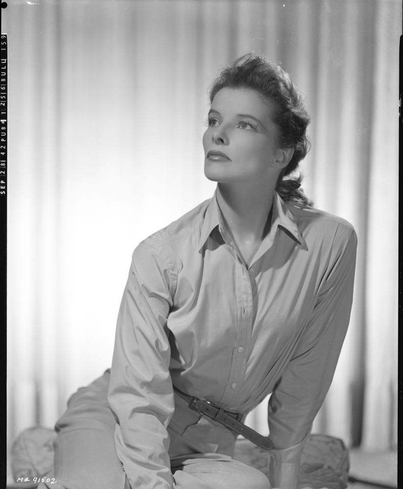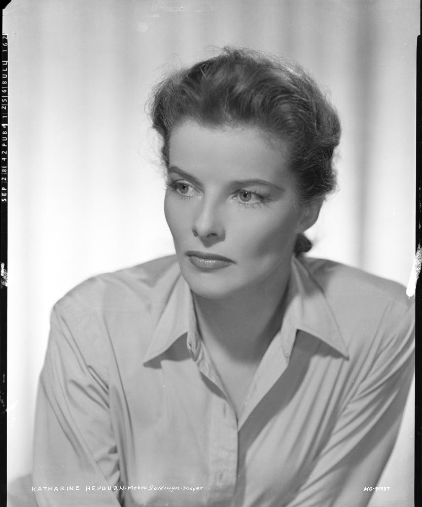 (M-G-M, 1941) Two black-and-white 8 x 10 in. camera negatives on safety film of Katharine Hepburn from Keeper of the Flame by Clarence Sinclair Bull; with SEP 28 42 PUB 1256 BULL 159 and SEP 28 42 PUB 1256 BULL 159 stamped on the border, KATHARINE HEPBURN - METRO-GOLDWYN-MAYER, MG91502 and MG-91337 in India ink and retouching. Fine; with missing upper left corner tip and mounting paper remnant at the borders to one.