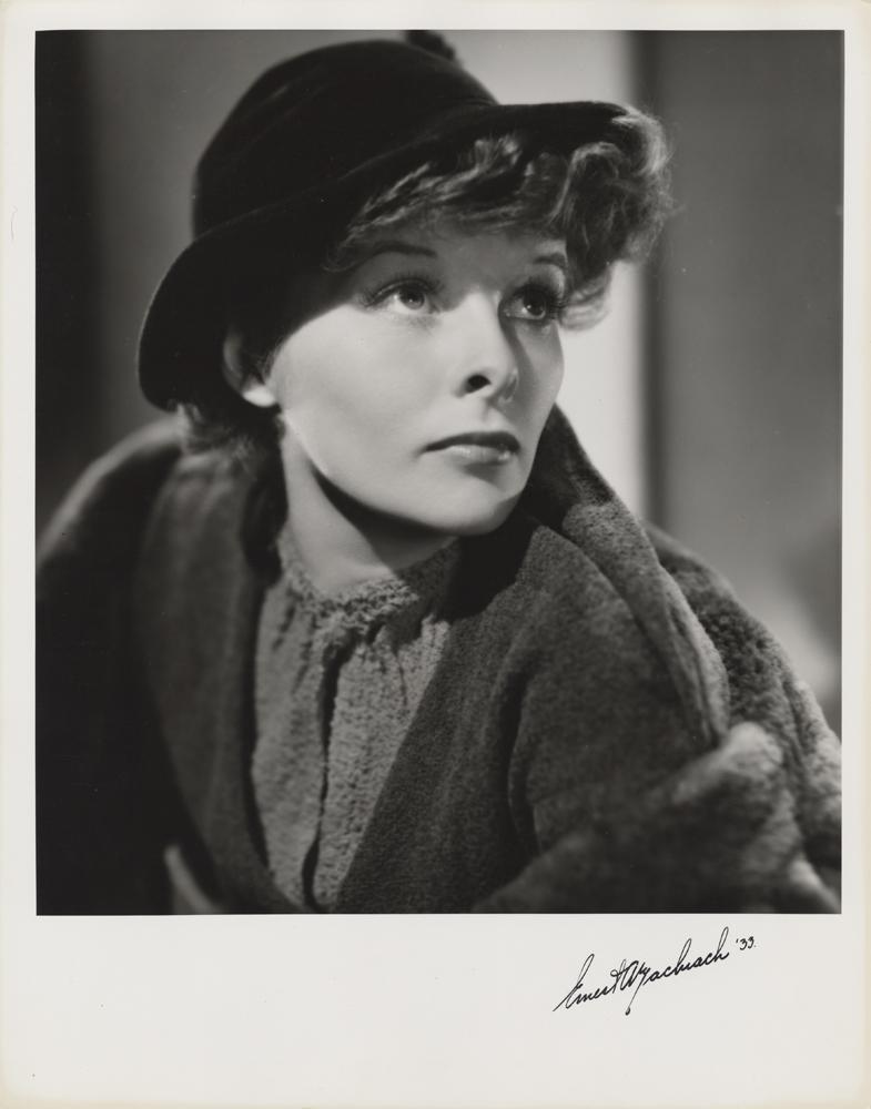 (RKO, 1933) Gelatin silver glossy double-weight 11 x 14 in. file print of Katharine Hepburn from Christopher Strong by Ernest A. Bachrach; with photographer signature Ernest A. Bachrach `33 in black felt on the recto margin, photographer and RKO rubber stamp on the verso. From the personal collection of the photographer. Excellent; with emulsion loss on the lower right margin corner.