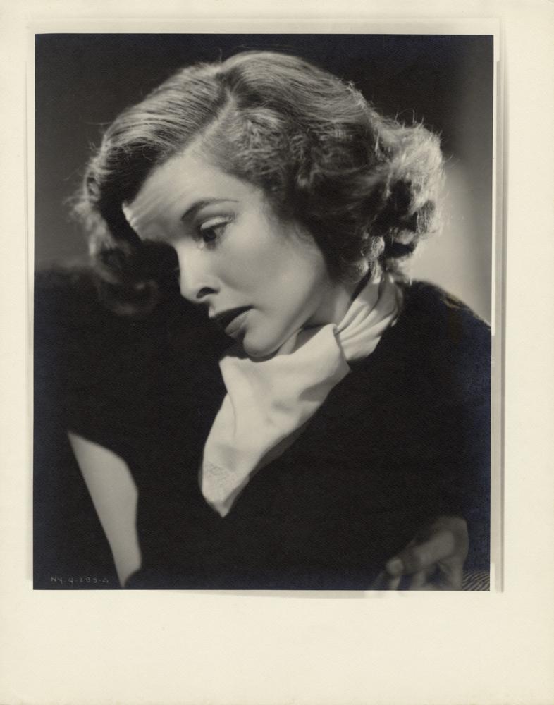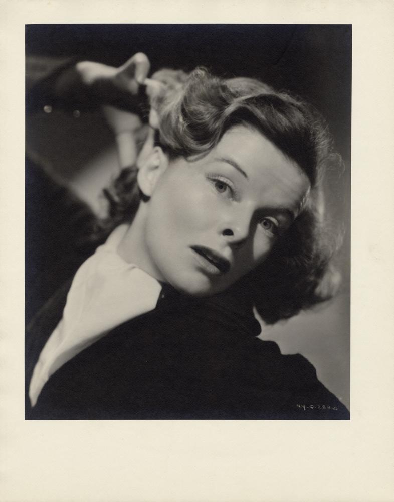 (RKO, 1936) Two silver bromide matte 11 x 14 in. file prints of Katharine Hepburn from A Woman Rebels by Ernest A. Bachrach; with portrait number NY-Q-288-A and NY-Q-289-A in India ink on the negative. From the personal collection of the photographer. Excellent.