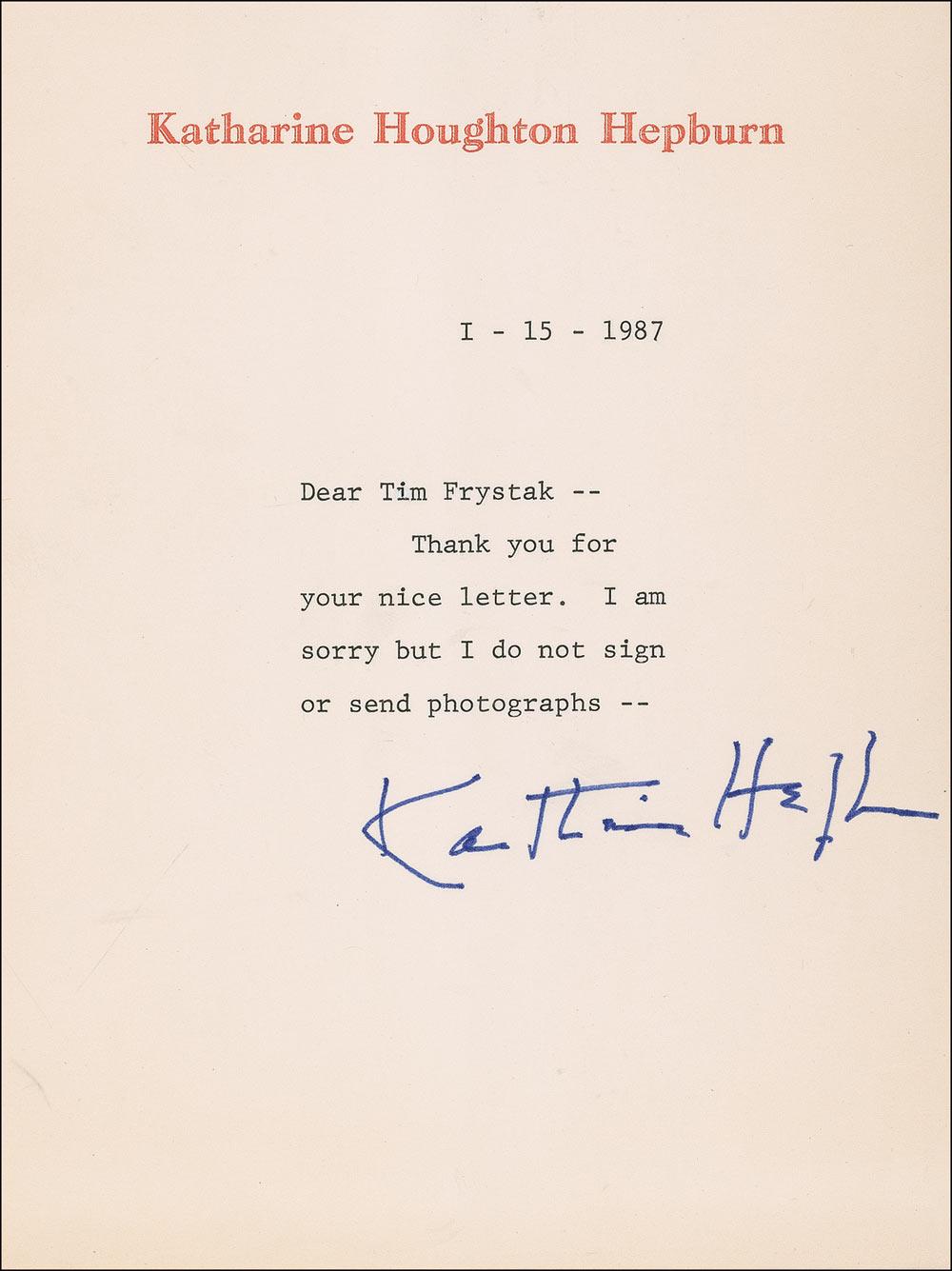 TLS, one page, 6 x 8, personal letterhead, January 15, 1987. Hepburn customarily declines an autograph request. In full: “Dear Tim Frystak—Thank you for your very nice letter. I am sorry but I do not send or sign photographs.” In fine condition.