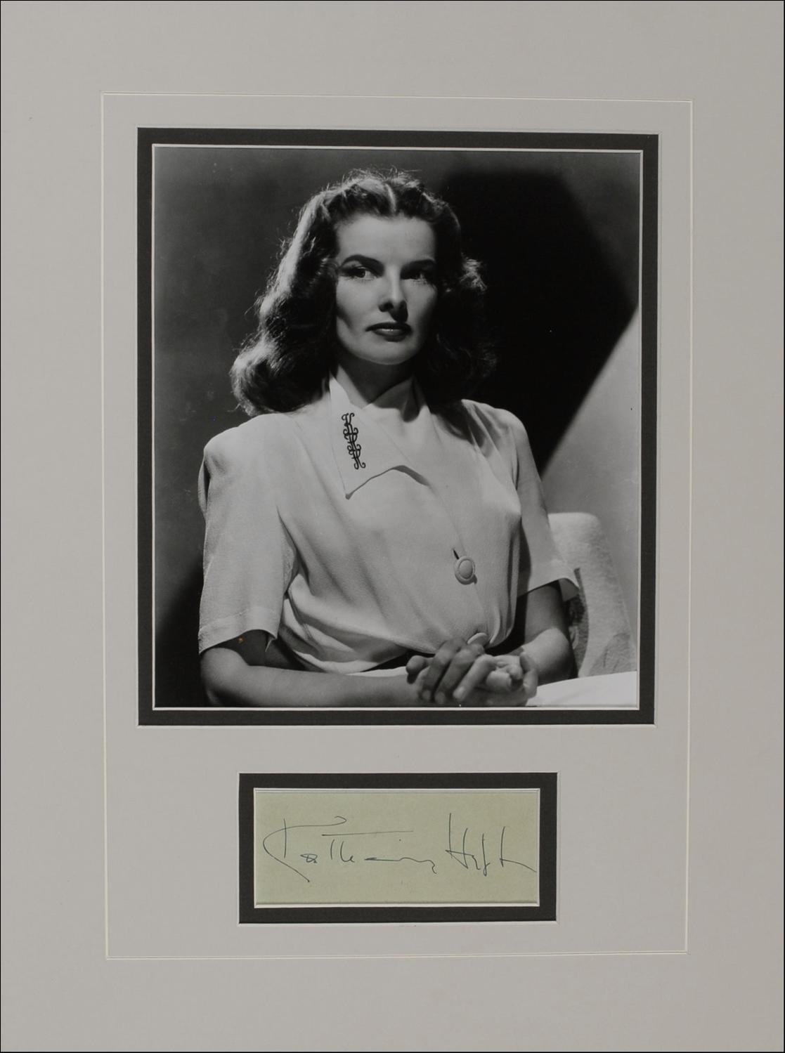 Vintage ink signature, “Katharine Hepburn,” on a light green album page. Matted with a beautiful portrait, to an overall size of 12 x 16. A few light creases, otherwise fine condition.