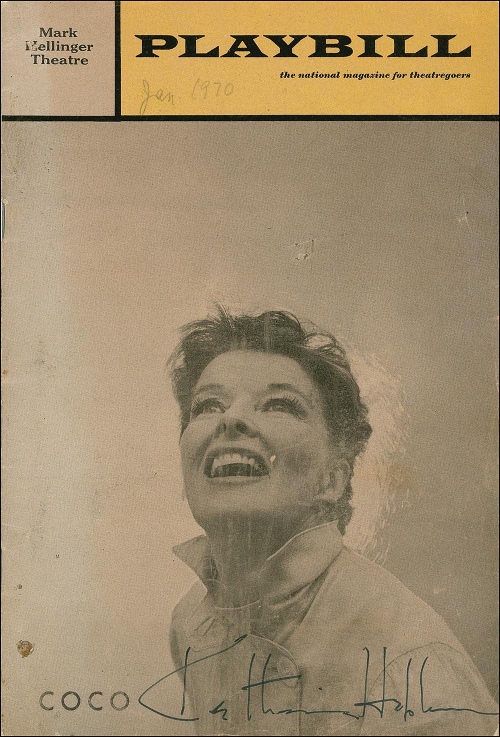 Playbill from the Mark Hellinger production of Coco, 6 x 9, 52 pages, signed on the front cover in black felt tip, “Katharine Hepburn.” Handling wear, uniform toning, scattered staining, two small holes with one repaired from the reverse with a small piece of old tape, and a pencil notation, otherwise very good condition.