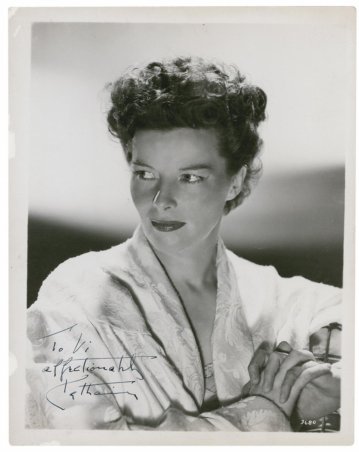 Scarce vintage glossy 8 x 10 MGM publicity photo, signed and inscribed in fountain pen “To Vi, affectionately, Katharine.” The photo’s recipient, Violet Murray, was a longtime wardrobe mistress who worked on over 20 films during the 1950s and 1960s, including The African Queen. Scattered creases and surface marks, and some small areas of surface loss to edges, otherwise very good condition. Hepburn was well known for her reluctance to sign photographs for anyone but friends and professional acquaintances; this one has excellent association to a film co-worker!