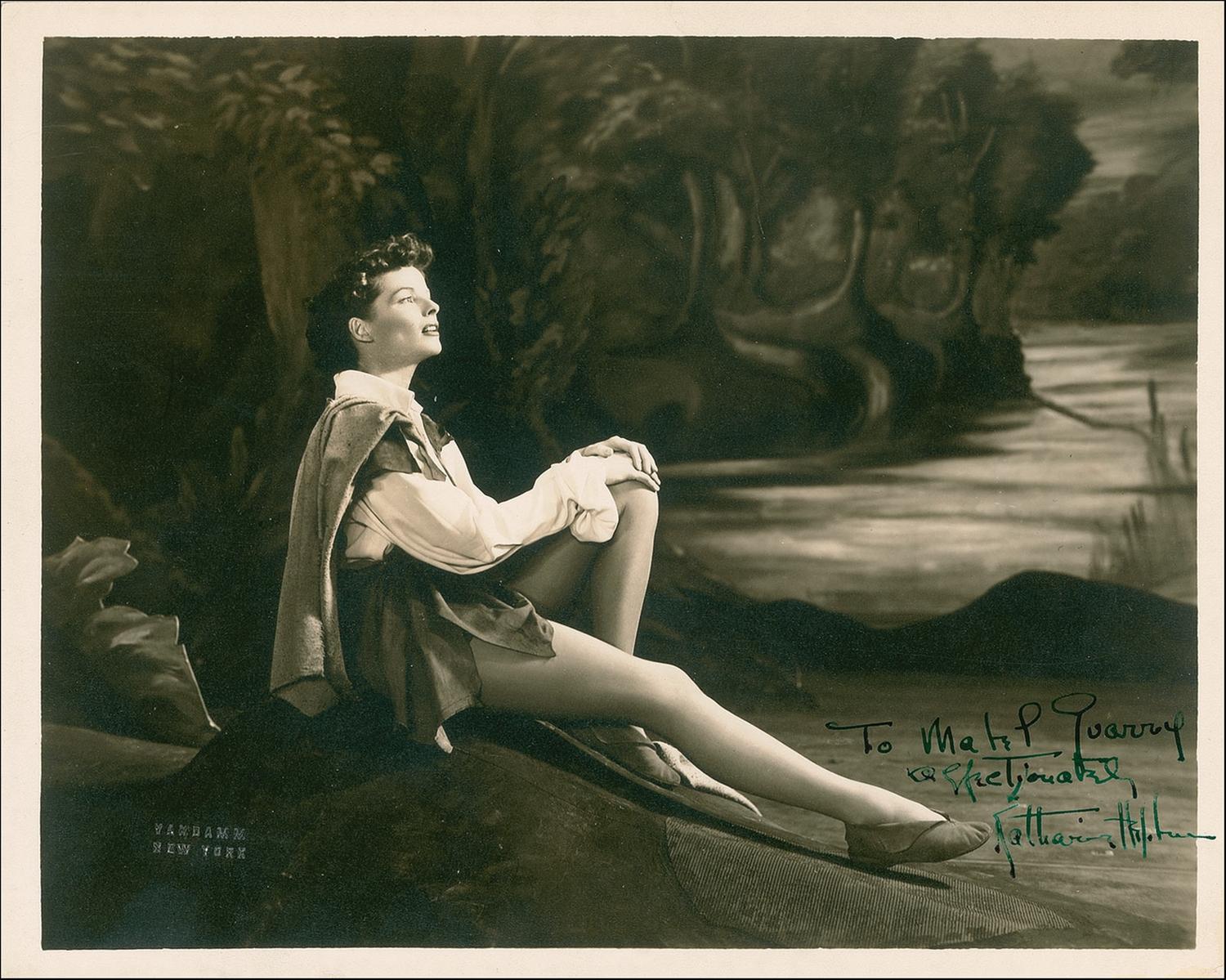 Vintage matte-finish 10 x 8 Vandamm photo of Hepburn as Rosalind/Ganymede from As You Like It, signed and inscribed in green fountain pen “To Matel Quarry, affectionately, Katharine Hepburn.” In fine condition, with scattered mild silvering to darker areas, and a few trivial corner tip creases.