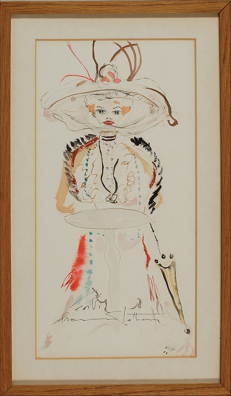 Original watercolor self-portrait, in costume as The Madwoman of Chaillot, on an off-white 6 x 12 sheet. Signed and inscribed in ink to wardrobe mistress Violet Murray, “For Vi, From Katharine.” Framed to an overall size of 9 x 15. In fine condition.