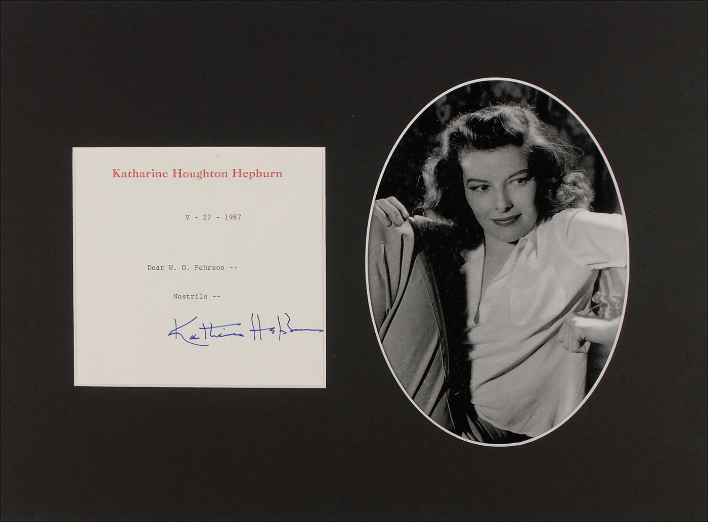 TLS, one page, 6 x 5.5, personal letterhead, dated “V–27–1987.” Hepburn writes a short, quirky letter. In full: “Nostrils––.” Matted with a stunning photo of Hepburn, to an overall size of 17 x 12.5. In fine condition, with horizontal crease running through the tallest letters of the signature, and a few trivial surface marks at the top.