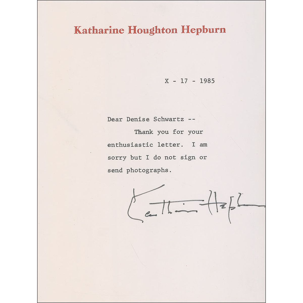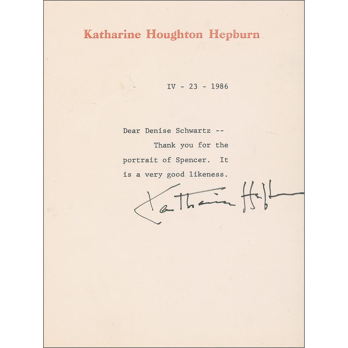 Two TLSs, both one page, 6 x 8, personal letterhead, dated 1985 and 1986 respectively. First letter reads, “Thank you for the portrait of Spencer. It is a very good likeness.” Second letter reads, “Thank you for your enthusiastic letter. I am sorry but I do not sign or send photographs.” In fine condition, with a central horizontal fold and mild toning to one letter.