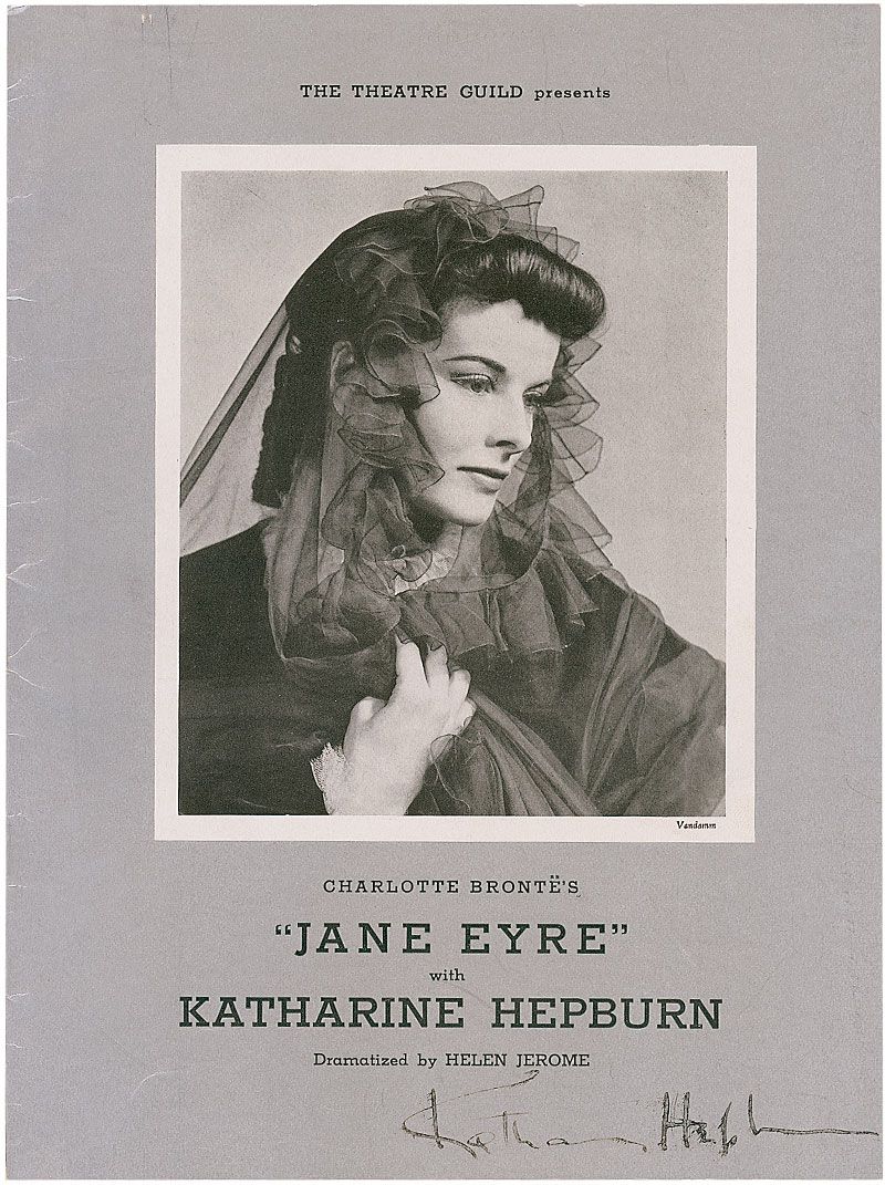 Original program for The Theatre Guild of New York’s production of Jane Eyre, 9 x 12, signed on the front cover in black ink by Hepburn. A few brushes to signature, some stray ink flecks around signature, and a bit of light creasing to cover, otherwise fine condition.