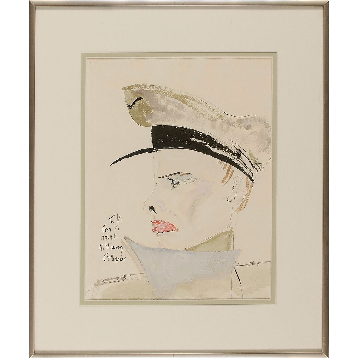 Wonderful original watercolor, ink, and oil profile self-portrait, dressed in a military hat and overcoat, 7.5 x 9.75, signed and inscribed in black ink to wardrobe mistress Violet Murray, “To Vi, Dear Vi, Only Vi, Not to worry, Katharine.” Double matted and framed to an overall size of 12 x 14.5. In fine condition. Hepburn’s love affair with painting can be traced to the 1930s, around the same time she began dating Howard Hughes, and continued until she was well into her 80s. This specific watercolor creation dates to around 1969—the year Hepburn starred as the title character in a Warner Bros. release. The recipient of this one-of-a-kind masterpiece was Violet ‘Vi’ Murray, wardrobe mistress for many of Hepburn’s films including The African Queen and The Lion in Winter.