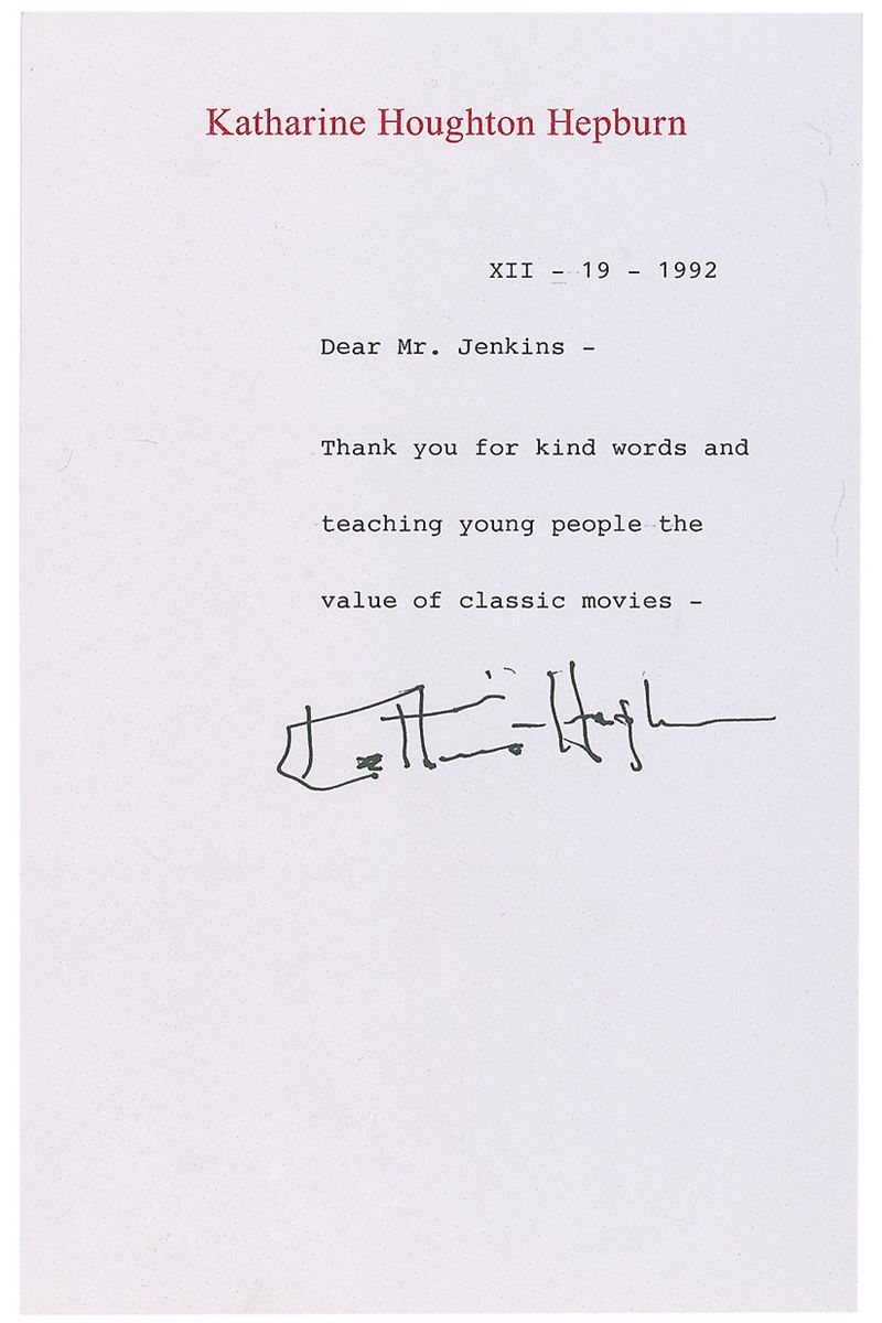 TLS, one page, 5.5 x 8.5, personal letterhead, July 19, 1992. A letter of thanks to a fan. In full: “Thank you for the kind words and teaching young people the value of classic movies.” In fine condition.