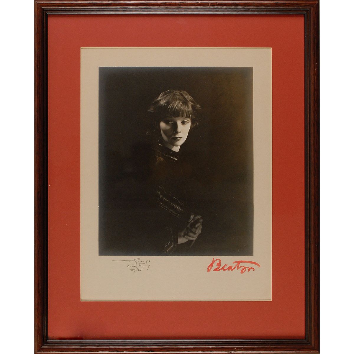 Scarce vintage matte-finish 7.25 x 9 photo, affixed to its original 9.25 x 12.25 mount, signed and inscribed in fountain pen on the mount to George Cukor, “To George, Everything, Kate.” Mount is also signed in red ink by Cecil Beaton, “Beaton.” Matted and framed to an overall size of 14 x 17.25. In fine condition, with some light silvering to edges of image. Hepburn was well known for her reluctance to sign photographs for anyone but friends and professional acquaintances; this one has excellent association between Hepburn and Cukor, who directed eight Hepburn films.