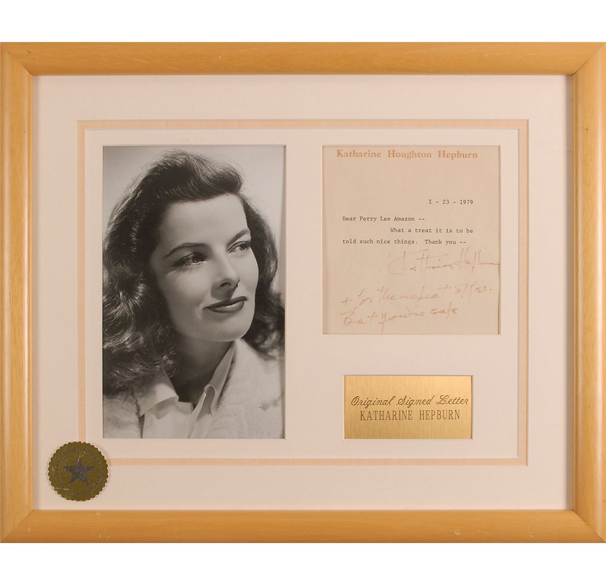 TLS, one page, 5 x 5.5, personal letterhead, January 23, 1979. Short letter of thanks. In full: “What a treat it is to be told such nice things. Thank you.” Under her signature, Hepburn adds a brief handwritten postscript, “& for the repeat offer. But you’re safe.” Triple-matted and framed with a portrait of Hepburn and a name plaque to an overall size of 17.5 x 14.5. A Walt Disney World Co. authentication label is affixed to front of the glass. In very good condition, with uniform toning and some slight fading to signature and postscript.