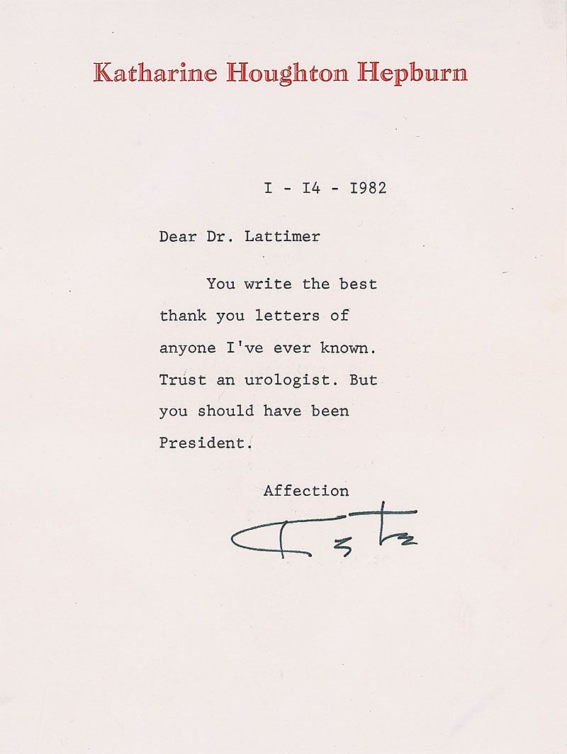 TLS signed “Kate,” one page, 6 x 8, personal letterhead, January 14, 1982. Letter to a doctor. In full: “You write the best thank you letters of anyone I’ve ever known. Trust an urologist. But you should have been President.” In fine condition.
