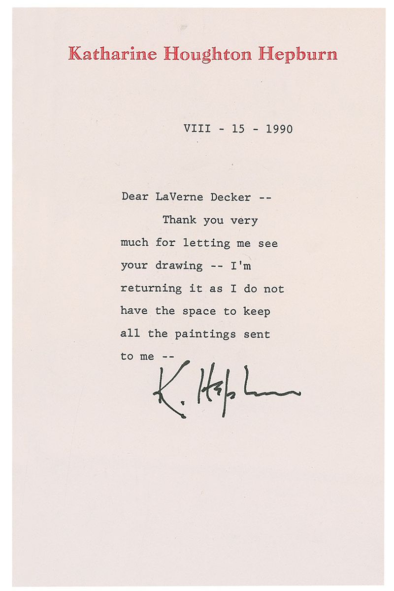 TLS signed “K. Hepburn,” one page, 5.5 x 8.5, personal letterhead, August 15, 1990. Letter to an admirer. In full: “Thank you very much for letting me see your drawing—I’m returning it as I do not have the space to keep all the paintings sent to me.” In very fine condition.